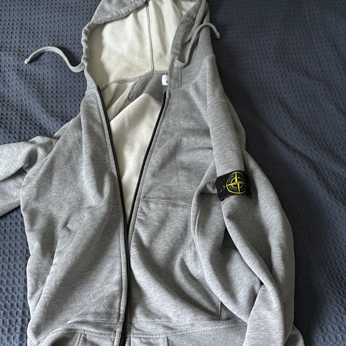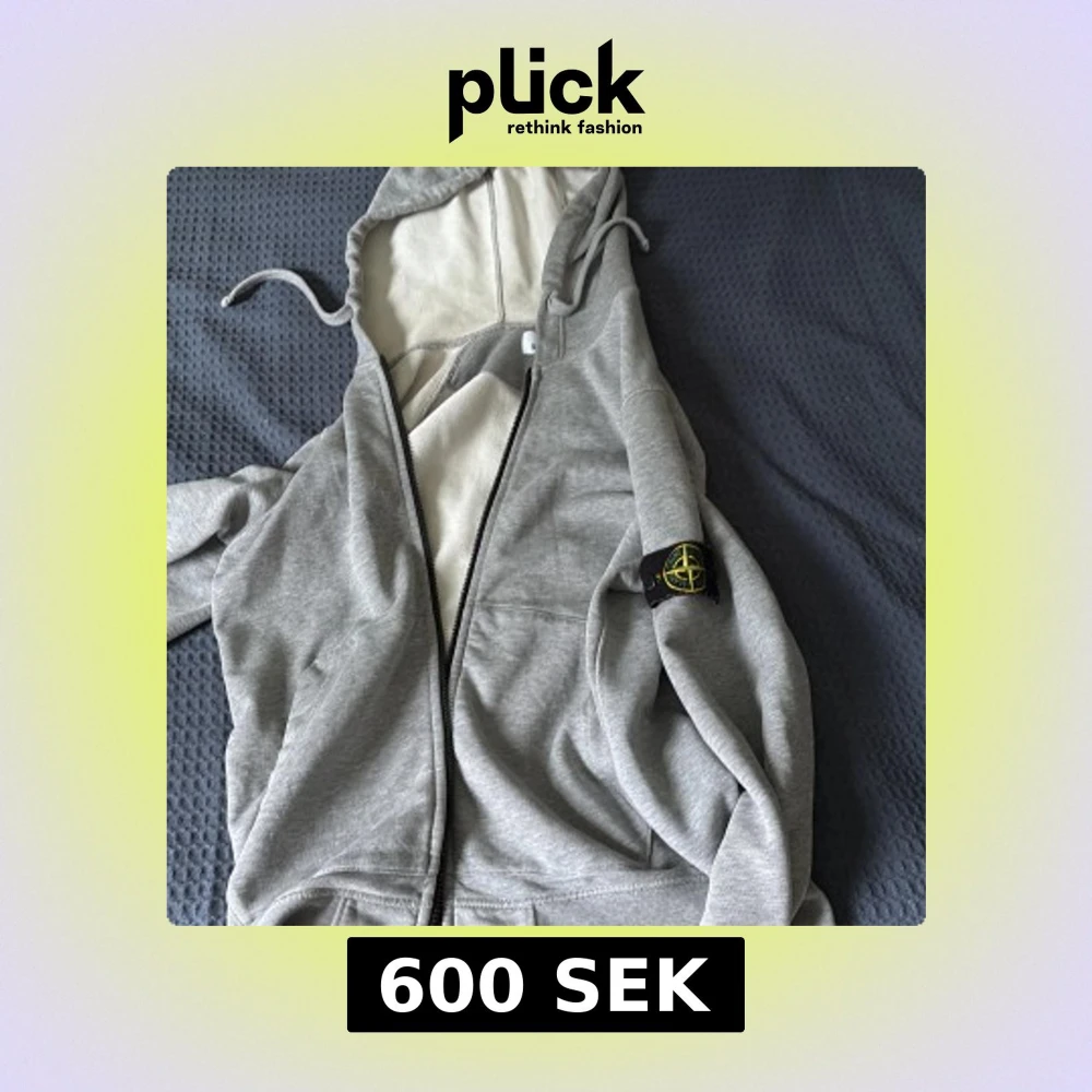 Snygg grå hoodie från Stone Island med dragkedja och klassisk logga på ärmen. Tröjan har huva med snörning och är tillverkad i mjuk bomull. Perfekt för dig som gillar streetwear och vill ha en stilren look.