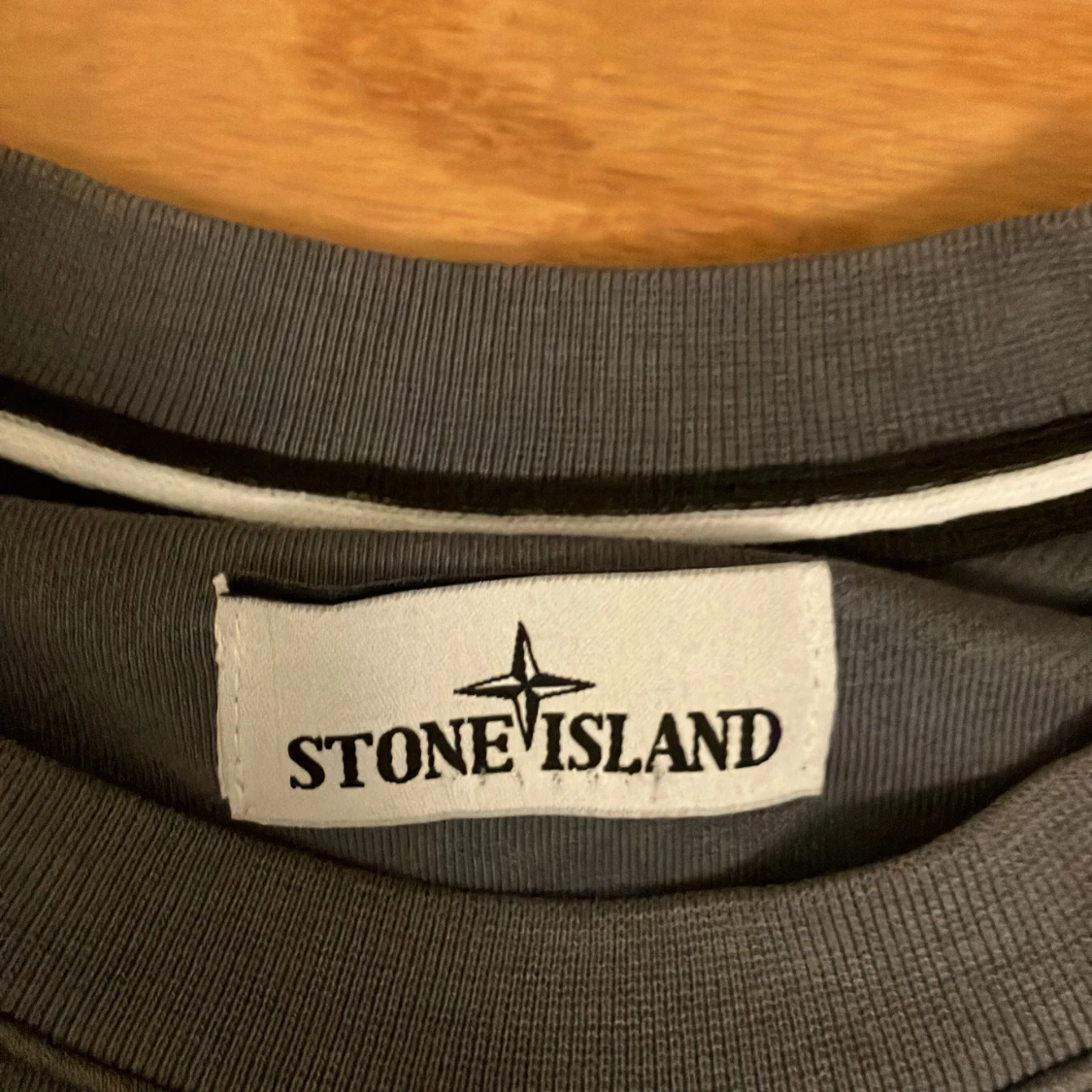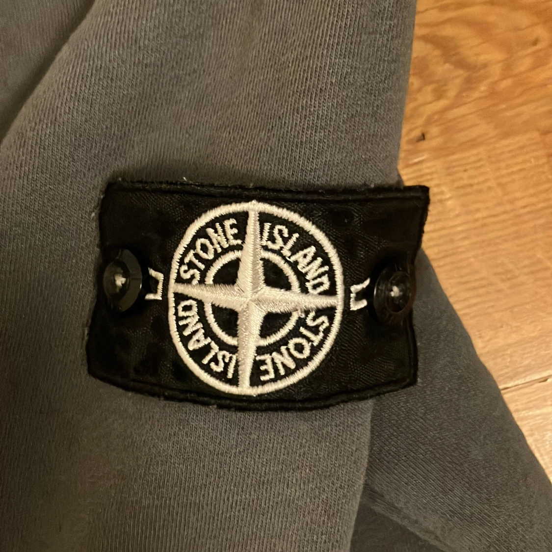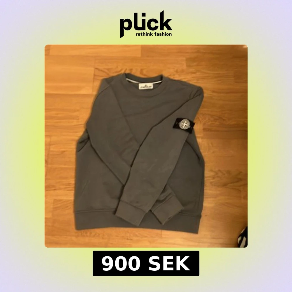 Säljer en stilren grå sweatshirt från Stone Island med deras ikoniska märke på ärmen. Tröjan har en klassisk passform och är perfekt för en avslappnad look. Tillverkad i mjukt material för extra komfort. Storlek M men passar S
