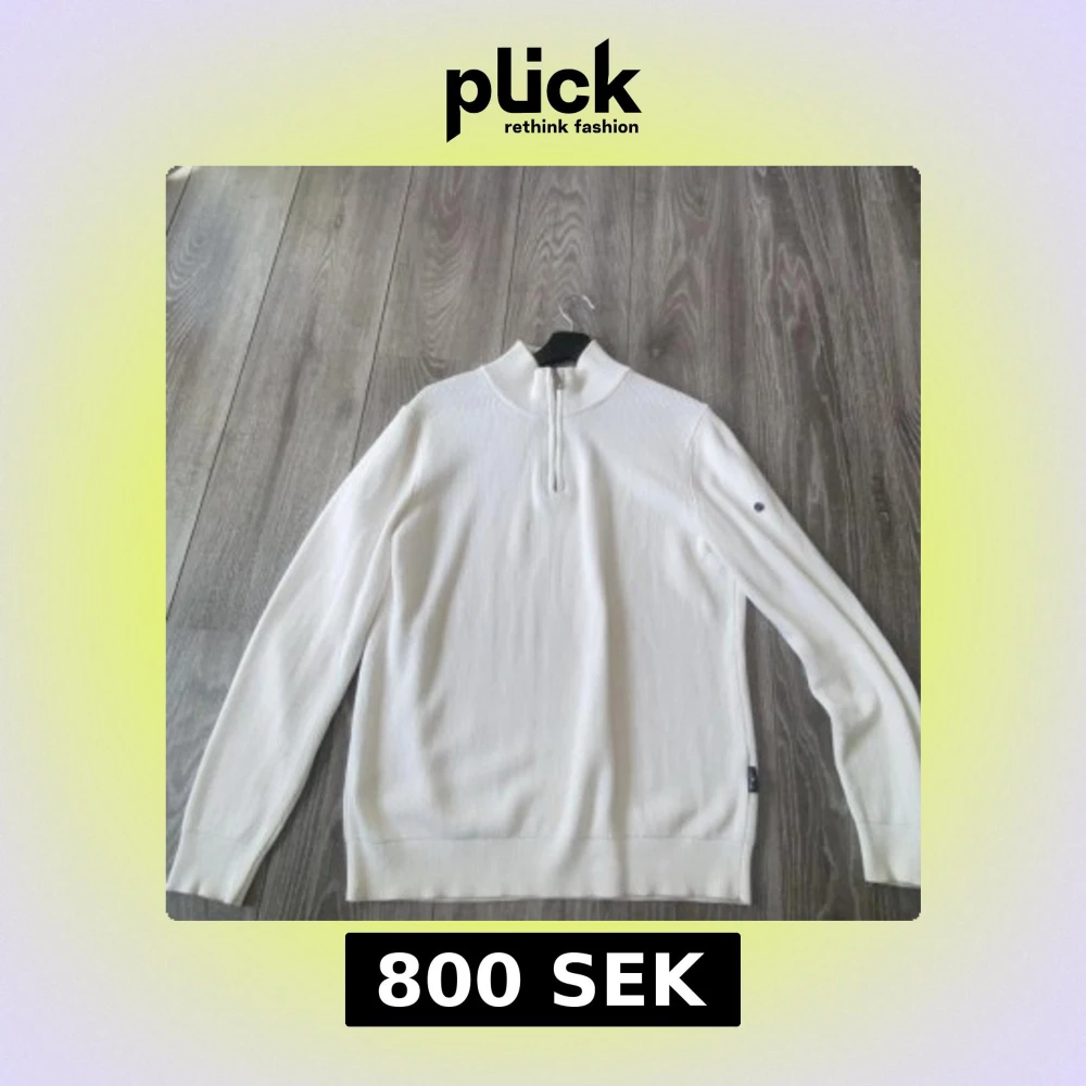 Snygg vit stickad tröja från Stone Island med half zip och grå detaljer på insidan av kragen. Långärmad modell med ribbad struktur och svarta knappar på ena ärmen. Perfekt för dig som gillar clean och stilren look. tyvär tappat bort den ikoniska etiketten på armen så därför är den billigare. köpt på NK en gång i tiden av farsan