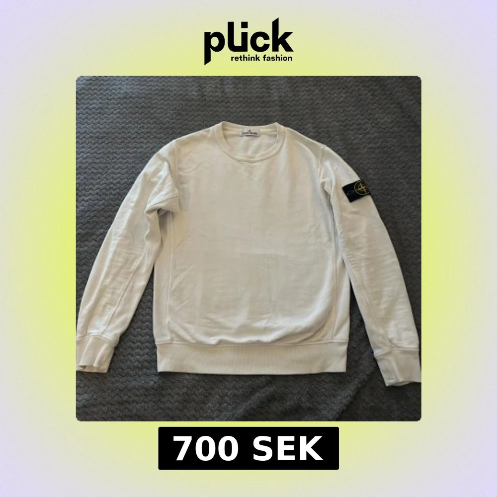 Säljer en stilren vit tröja från Stone Island med deras ikoniska märke på ärmen. Tröjan är sparsamt använt och har inga defekter.