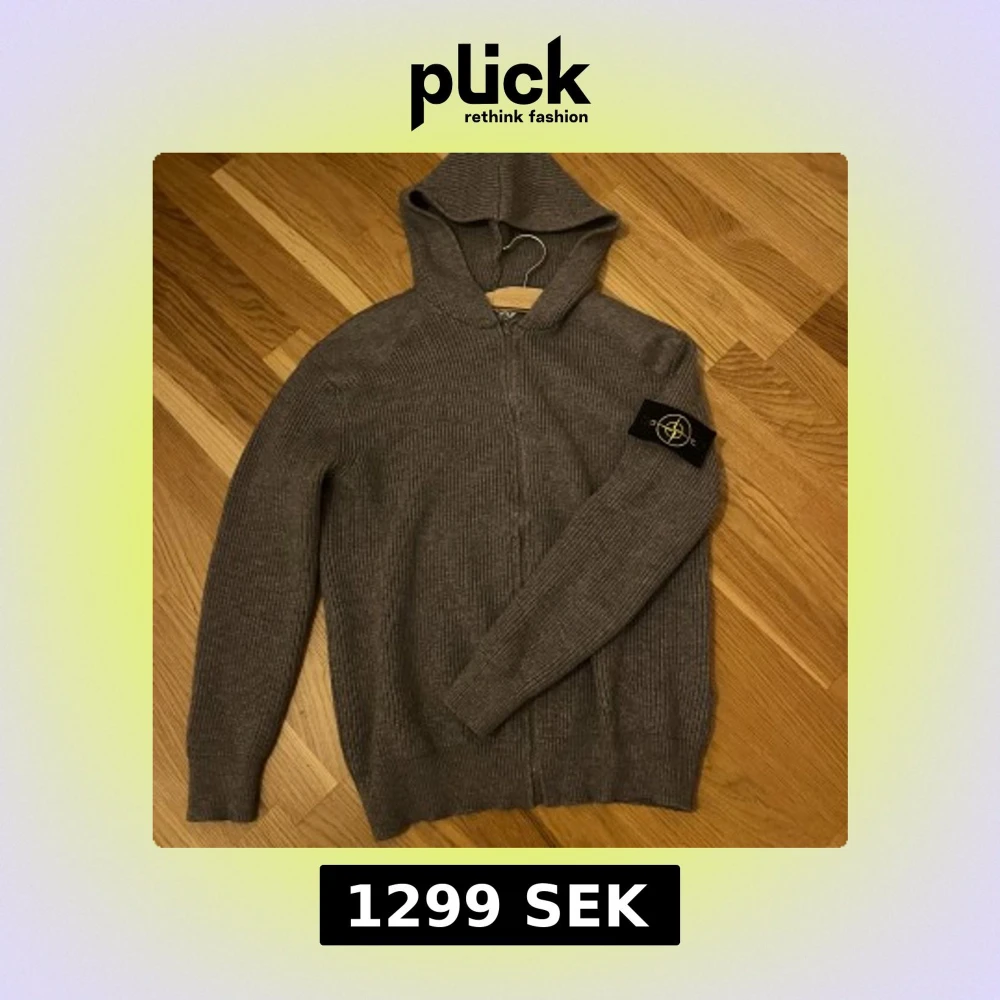 Säljer en grå stickad cardigan från Stone Island med dragkedja och klassisk logga på ärmen. Tröjan har huva, ribbad struktur och långa ärmar. Perfekt för dig som gillar streetwear och vill ha något både snyggt och bekvämt.