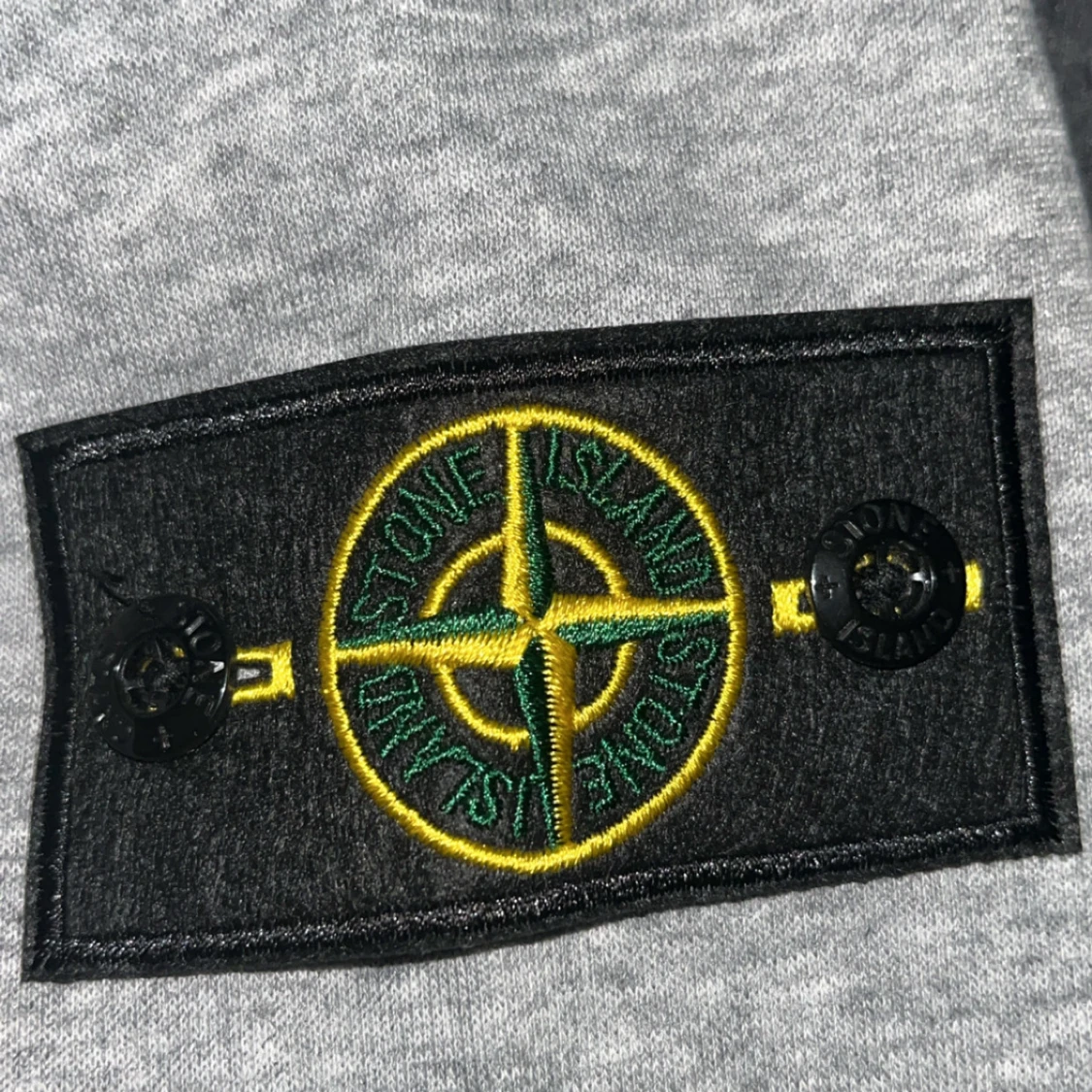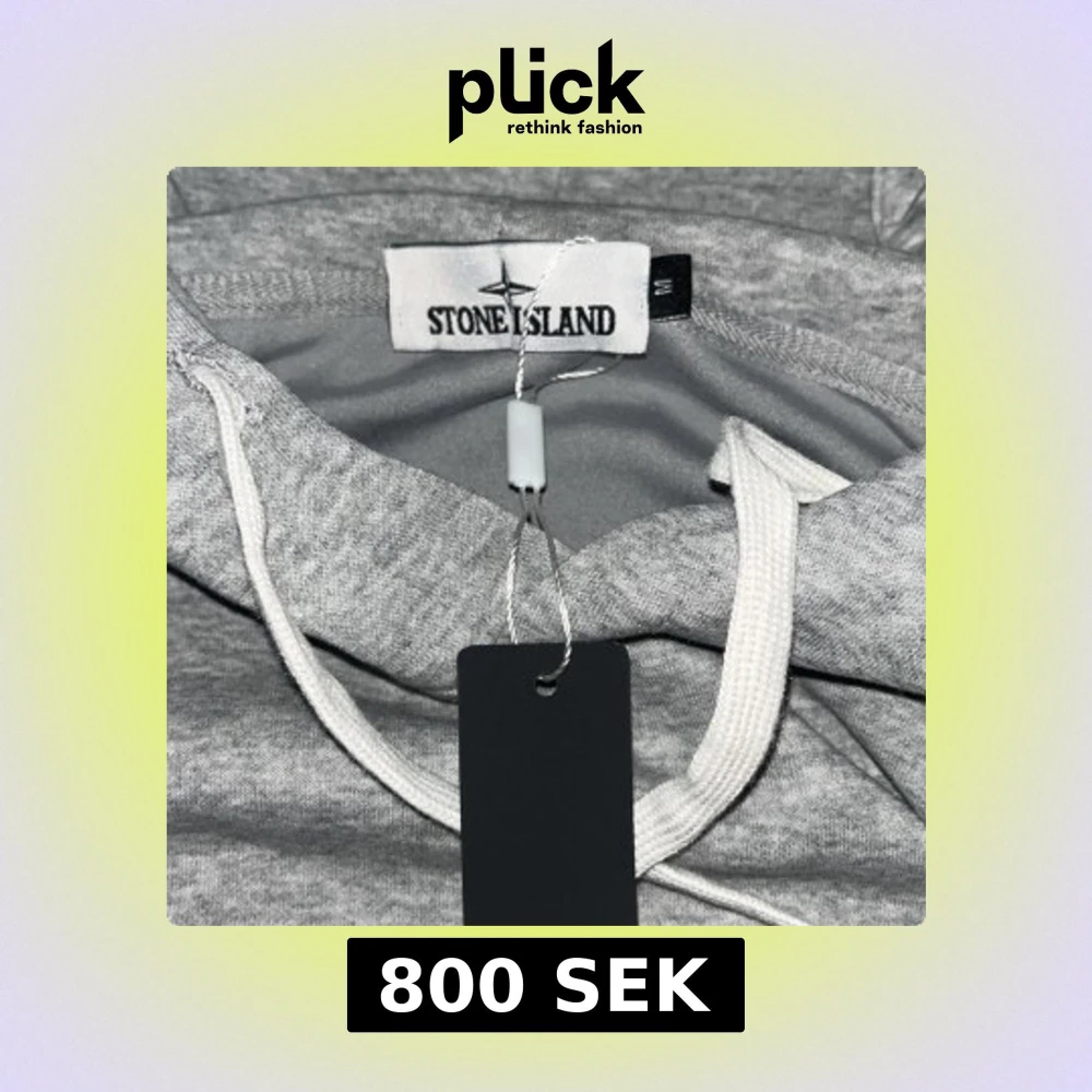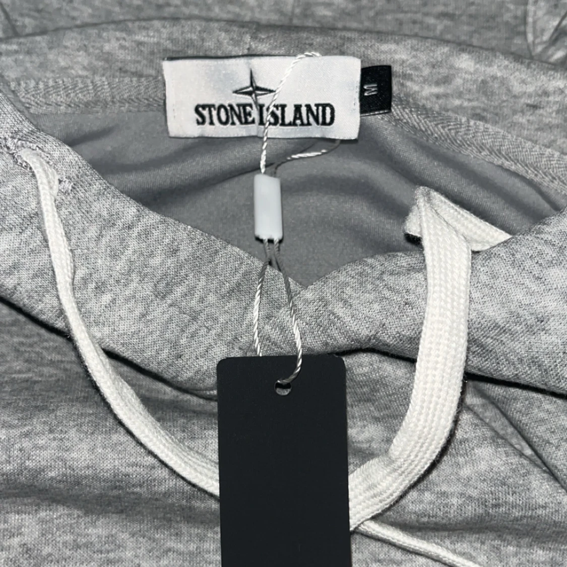 Aldrig använd. Snygg grå hoodie från Stone Island med klassisk logga på ärmen. Tröjan har huva med vita snören och en stor magficka. Perfekt för dig som gillar streetwear och vill ha en stilren look med premiumkänsla. 1 av 1