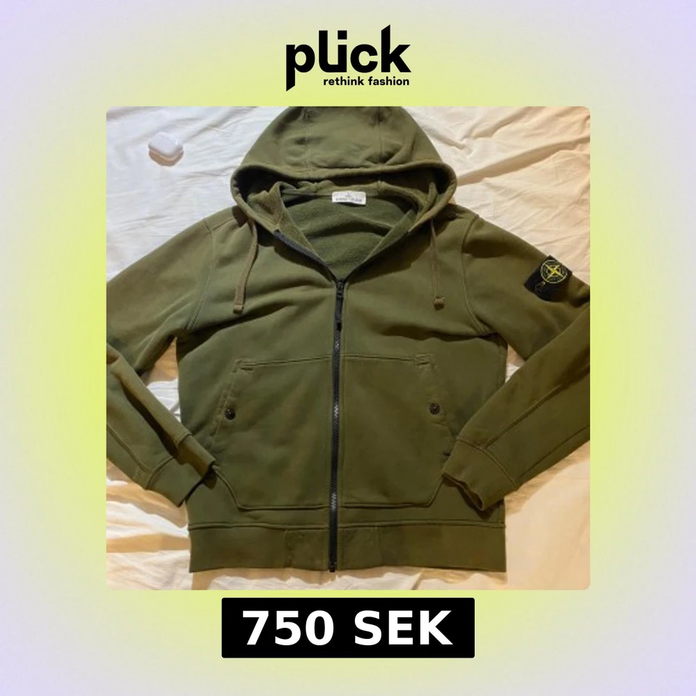 Säljer en grön hoodie från Stone Island med huva och dragkedja framtill. Tröjan har långa ärmar, två fickor med knappar och den klassiska Stone Island-loggan på vänster ärm. Perfekt för dig som gillar streetwear och snygga detaljer.