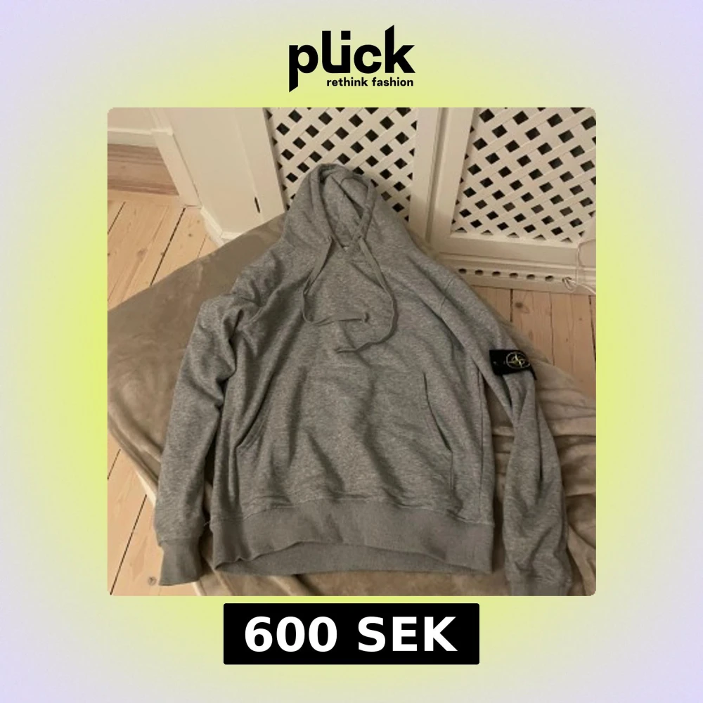 Snygg grå hoodie från Stone Island med klassisk logopatch på vänster ärm. Tröjan har huva med snörning, ribbade muddar och en stor magficka. Perfekt för chill dagar och streetwear-stil. Mjuk bomullskvalitet och normal passform.