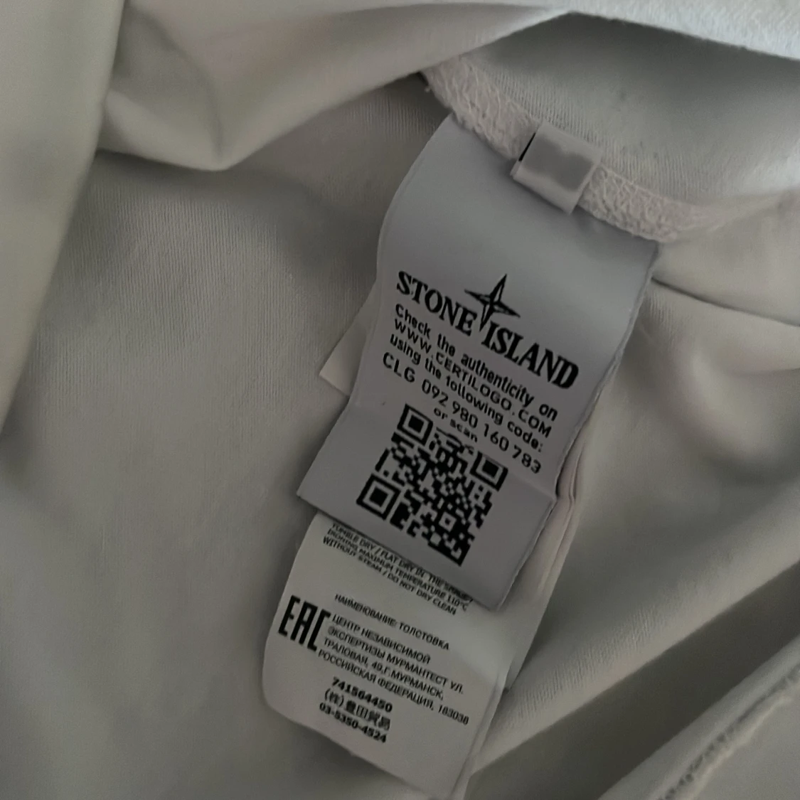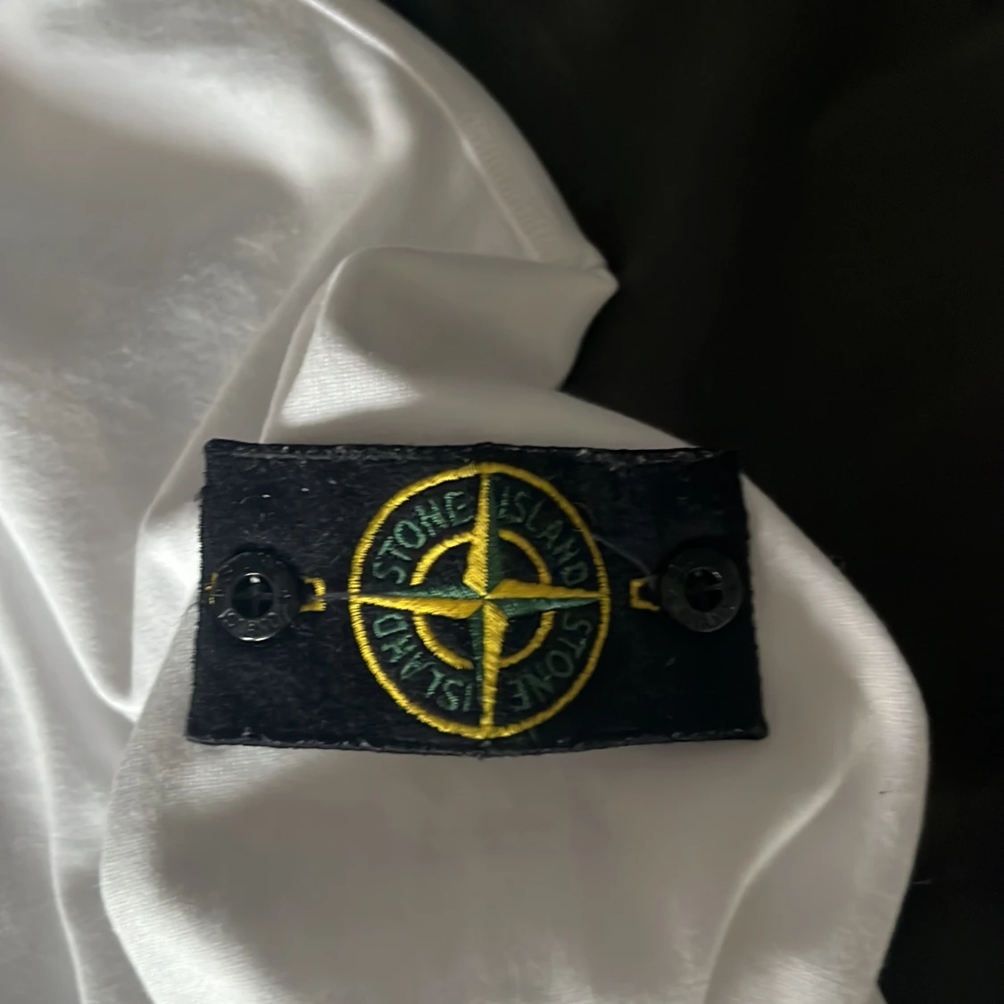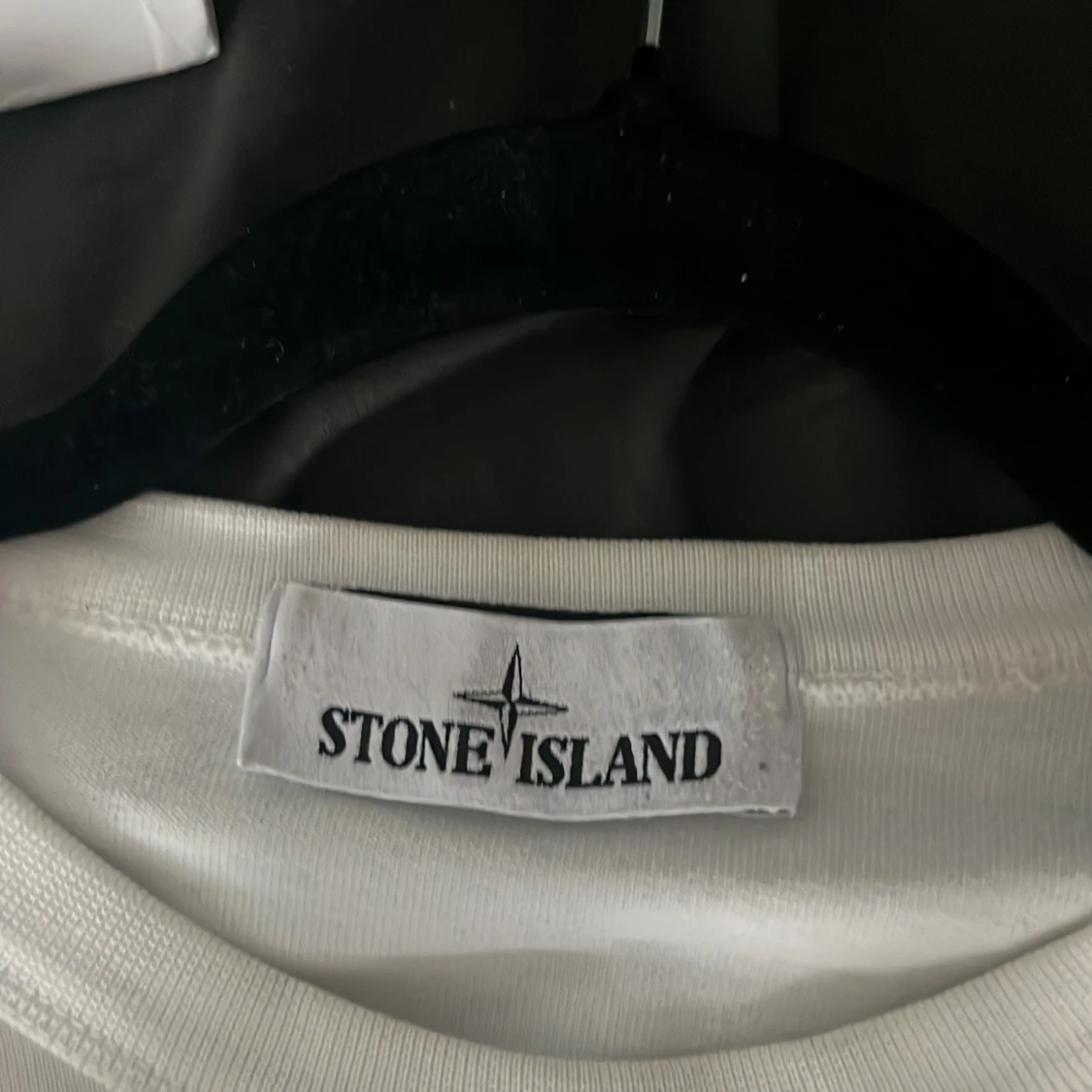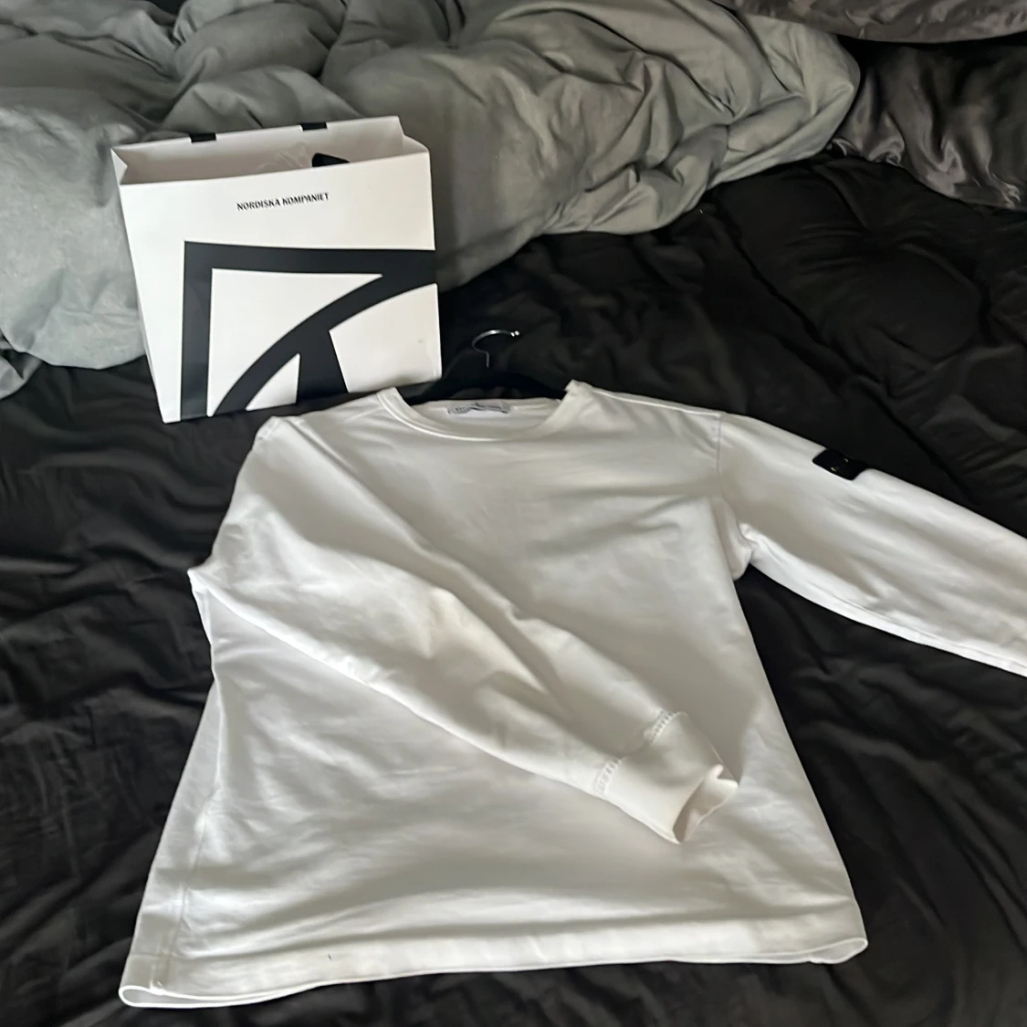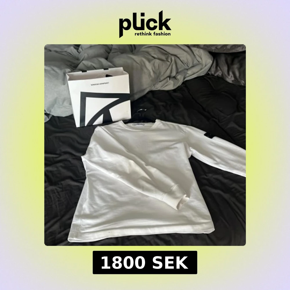 Säljer en stilren vit långärmad tröja från Stone Island. Tröjan har en klassisk design med märkets ikoniska logotyp på ärmen. Perfekt för en avslappnad och trendig look.
