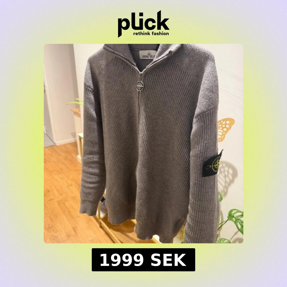 Säljer en grå stickad kofta från Stone Island med dragkedja och hög krage. Tröjan har långärmad passform och den klassiska Stone Island-loggan på vänster ärm. Ribbad struktur och snygg detalj på dragkedjan.