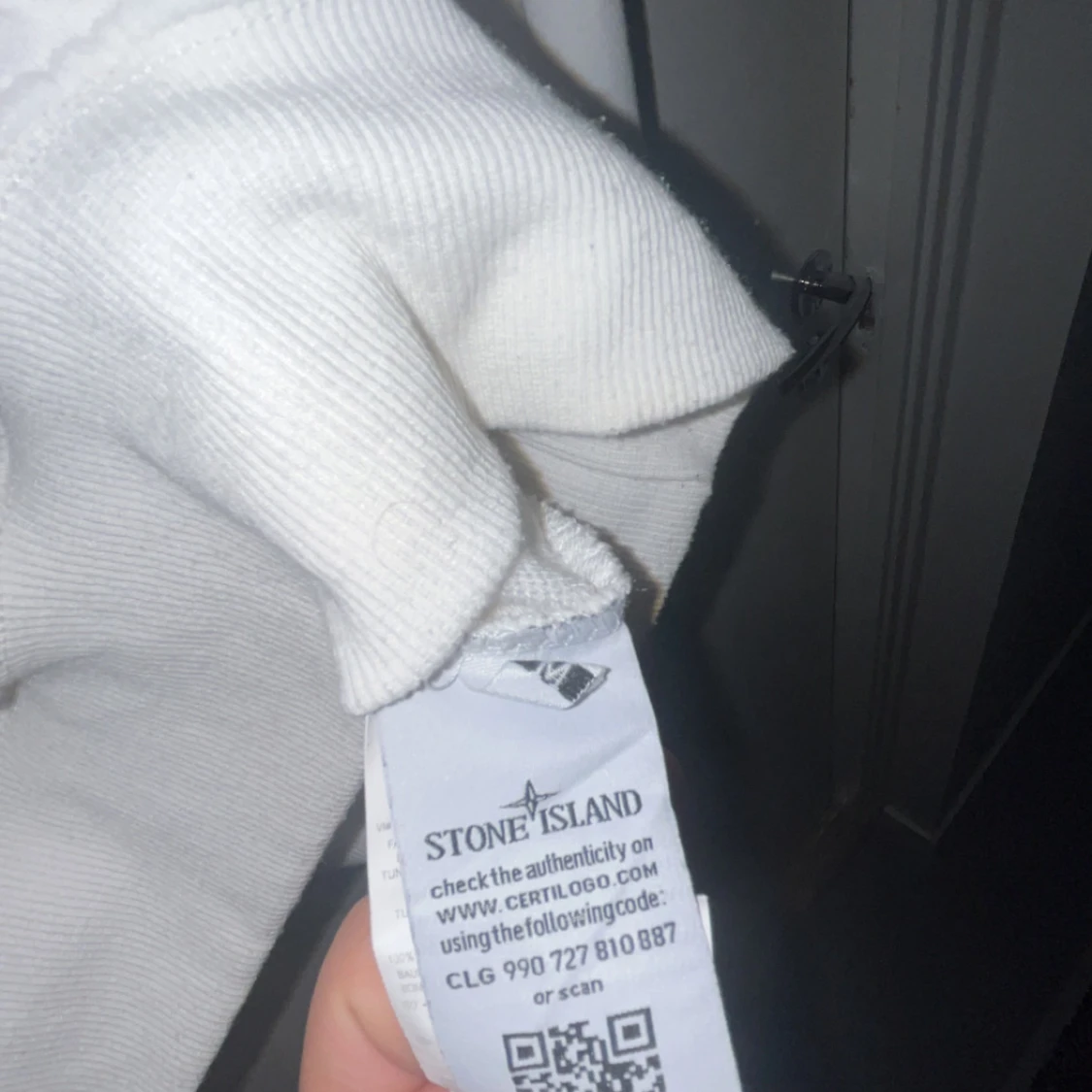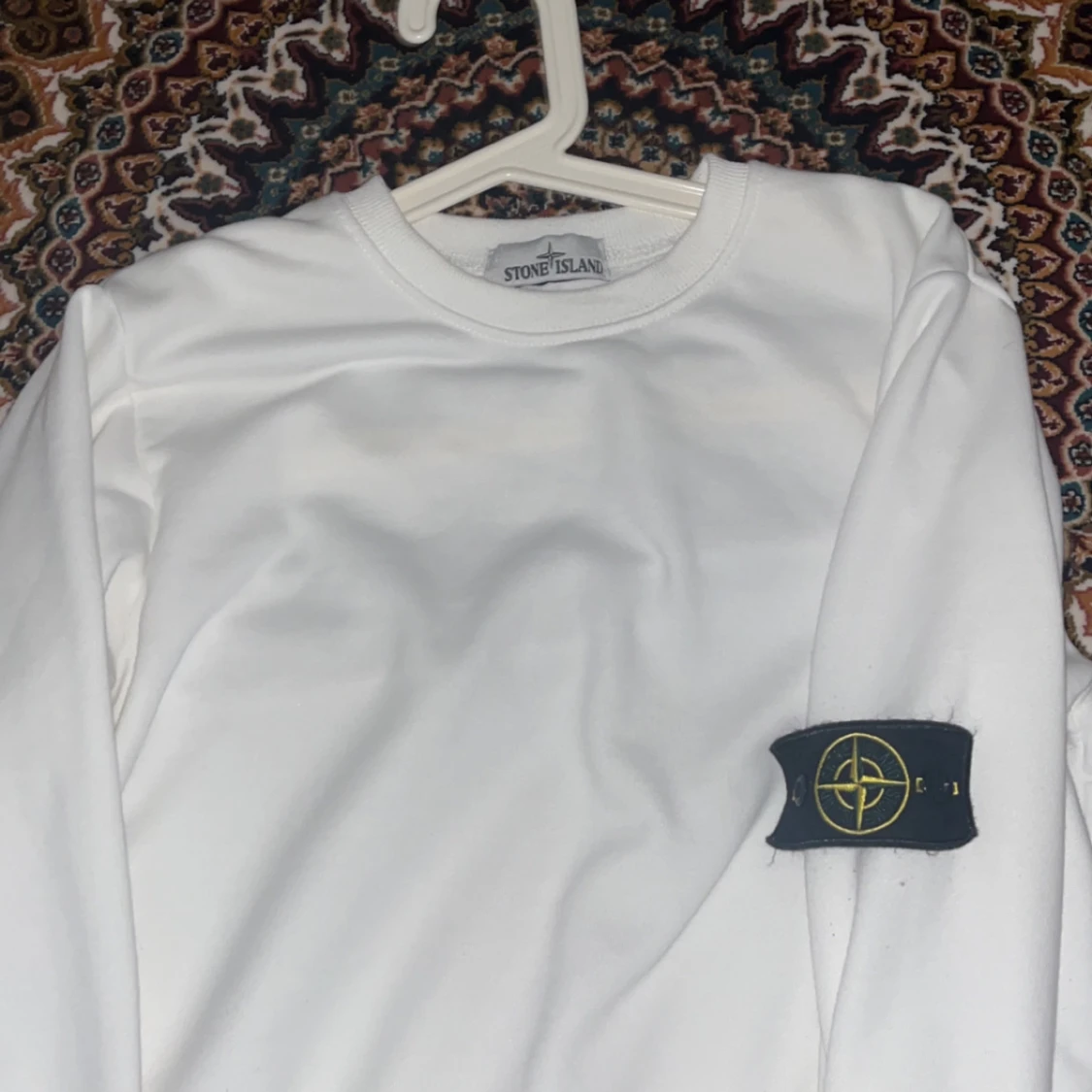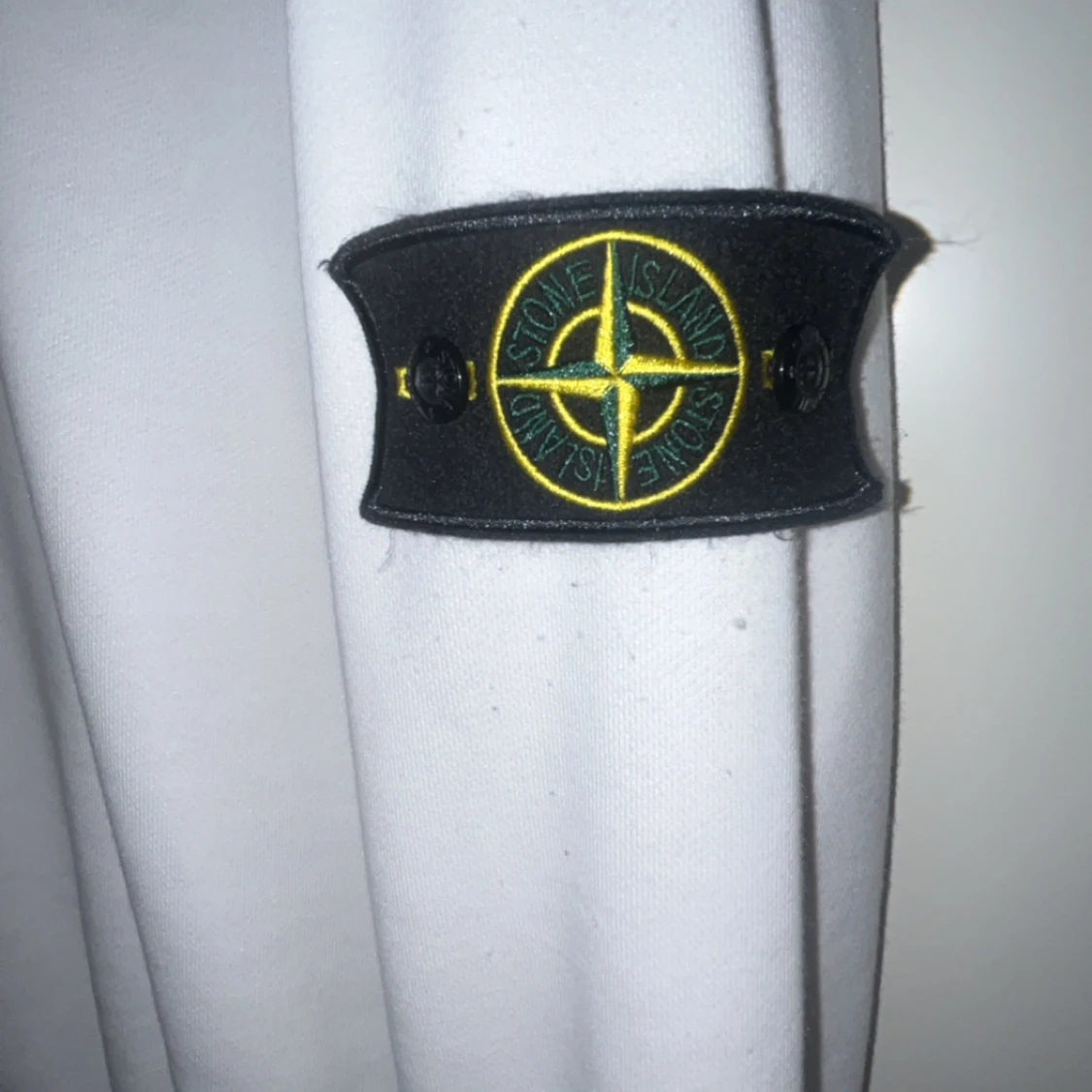 Vit långärmad tröja från Stone Island med klassisk rund hals och ikonisk patch på vänster ärm. Tröjan är i mjuk bomull och har en clean, stilren look som passar perfekt till streetwear eller casual outfits.