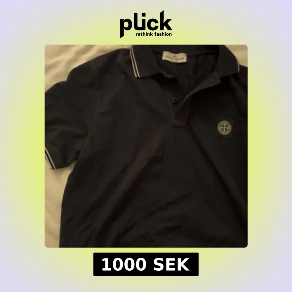 Snygg mörkvlå pikétröja från Stone Island med klassisk krage och vita ränder på krage och ärmslut. Tröjan har korta ärmar och den ikoniska Stone Island-loggan på bröstet. Perfekt för dig som gillar streetwear och vill ha en clean look. köptes för 1400 ny på nk använd max 5 ggr