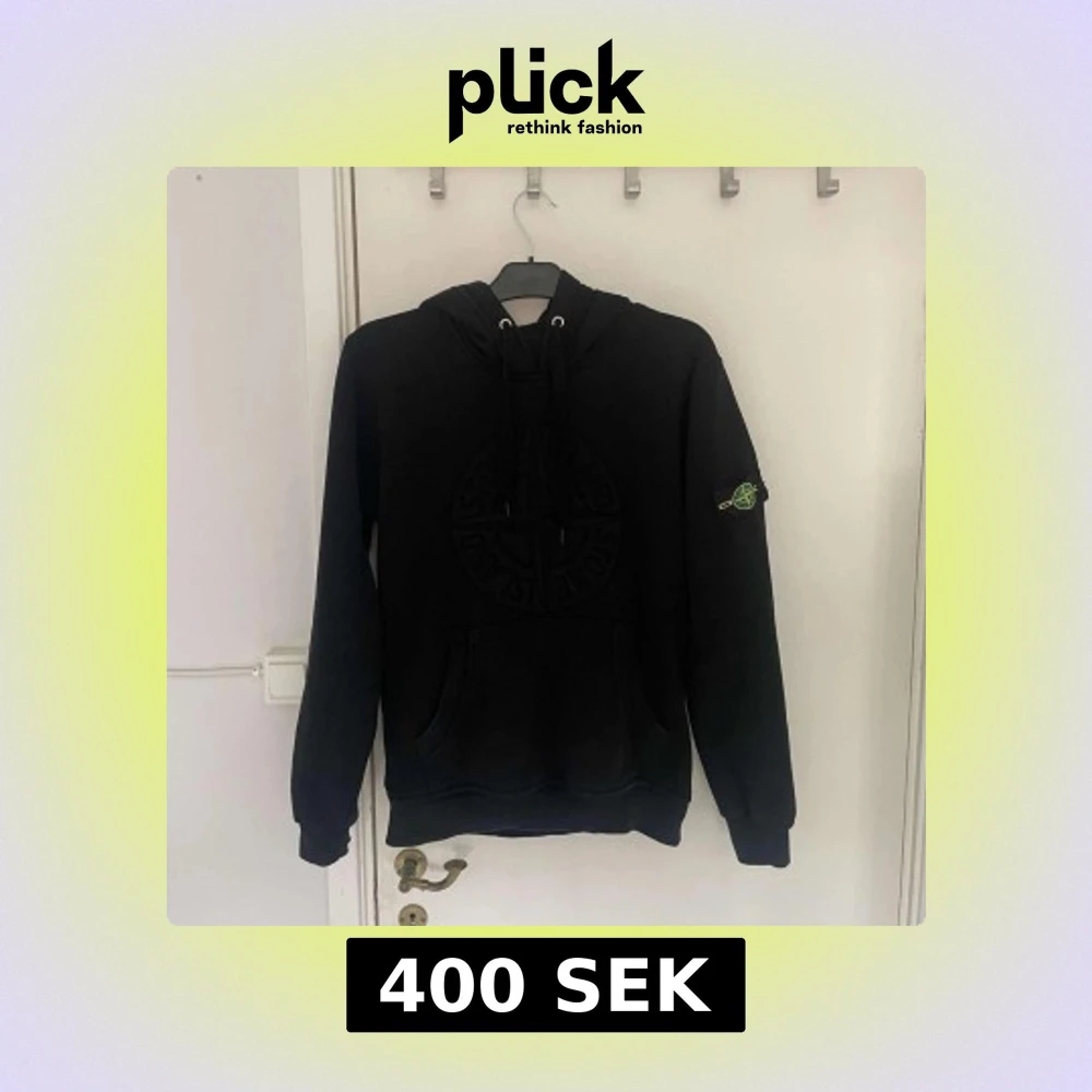 Säljer en svart hoodie från Stone Island med klassisk logga på armen och på bröstet | Perfekt för en avslappnad och stilren look | Tröjan är väl omhändertagen och är i bra skick |