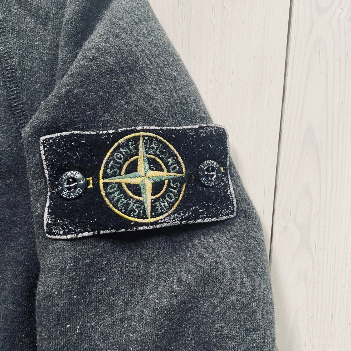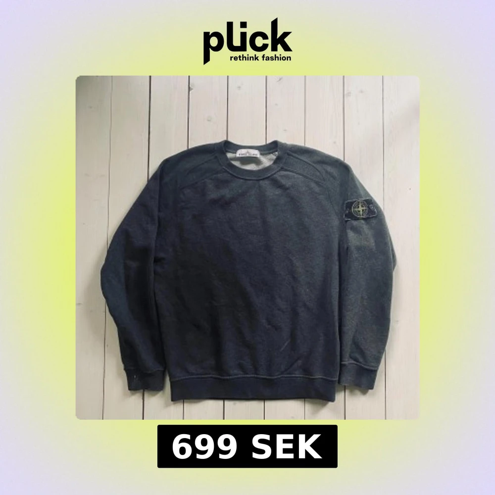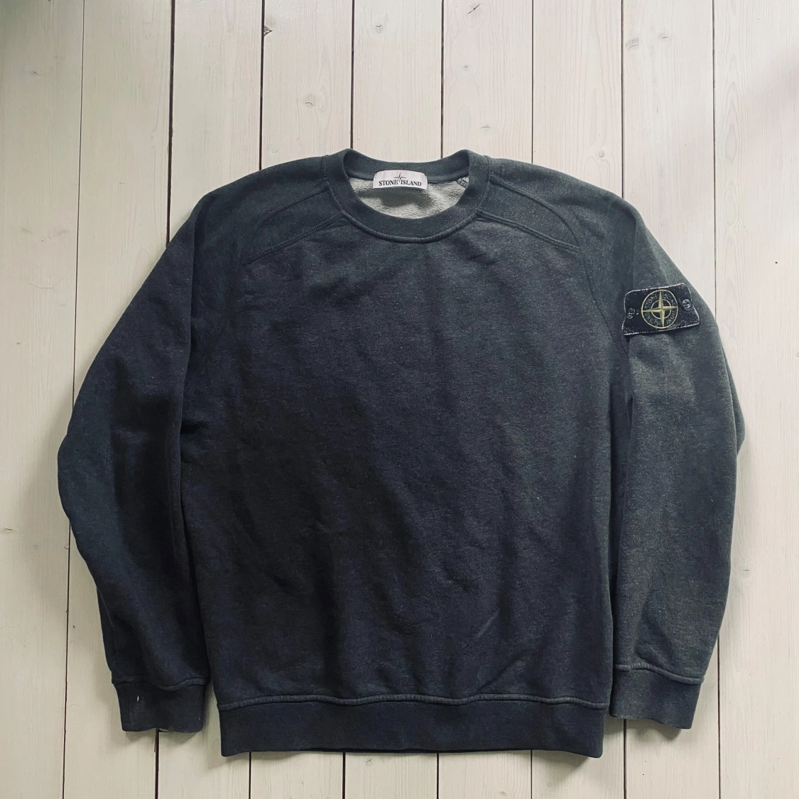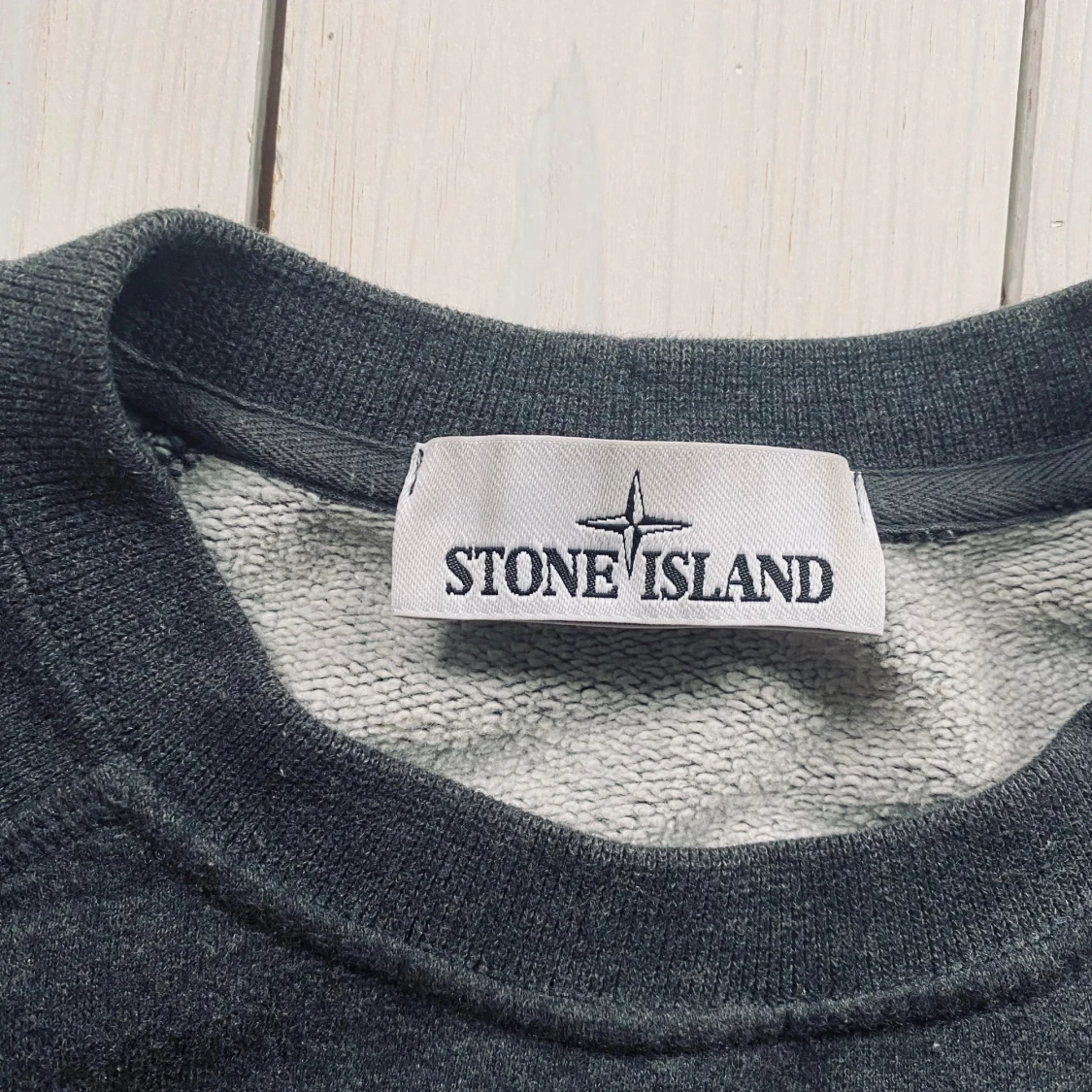 Säljer en mörkgrå sweatshirt från Stone Island med klassisk rund hals och ribbade muddar. Tröjan har den ikoniska Stone Island-patchen på vänster ärm och är tillverkad i mjuk bomull. Perfekt för dig som gillar streetwear och snygga detaljer.