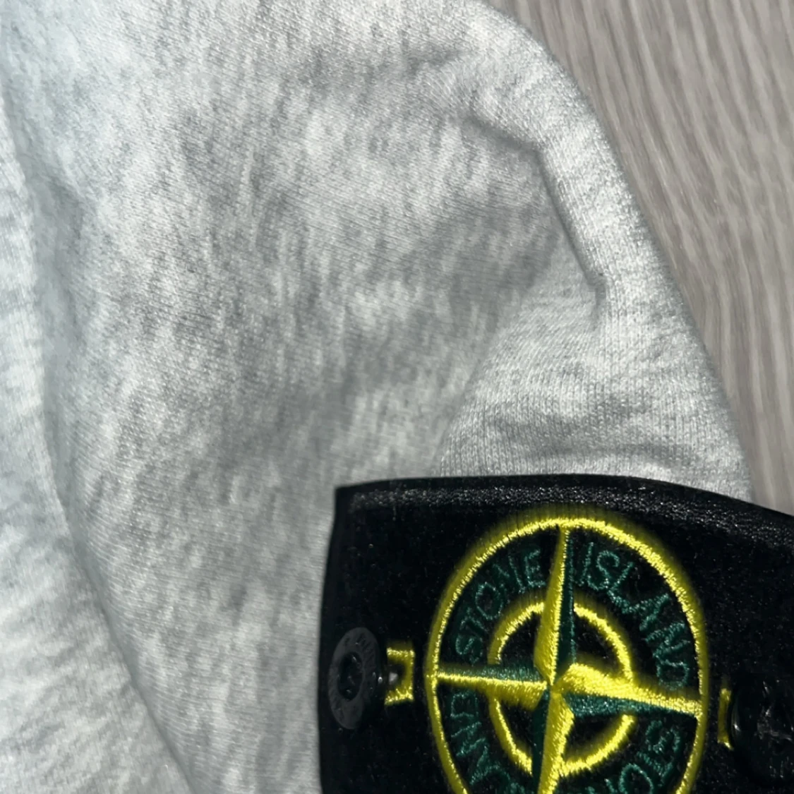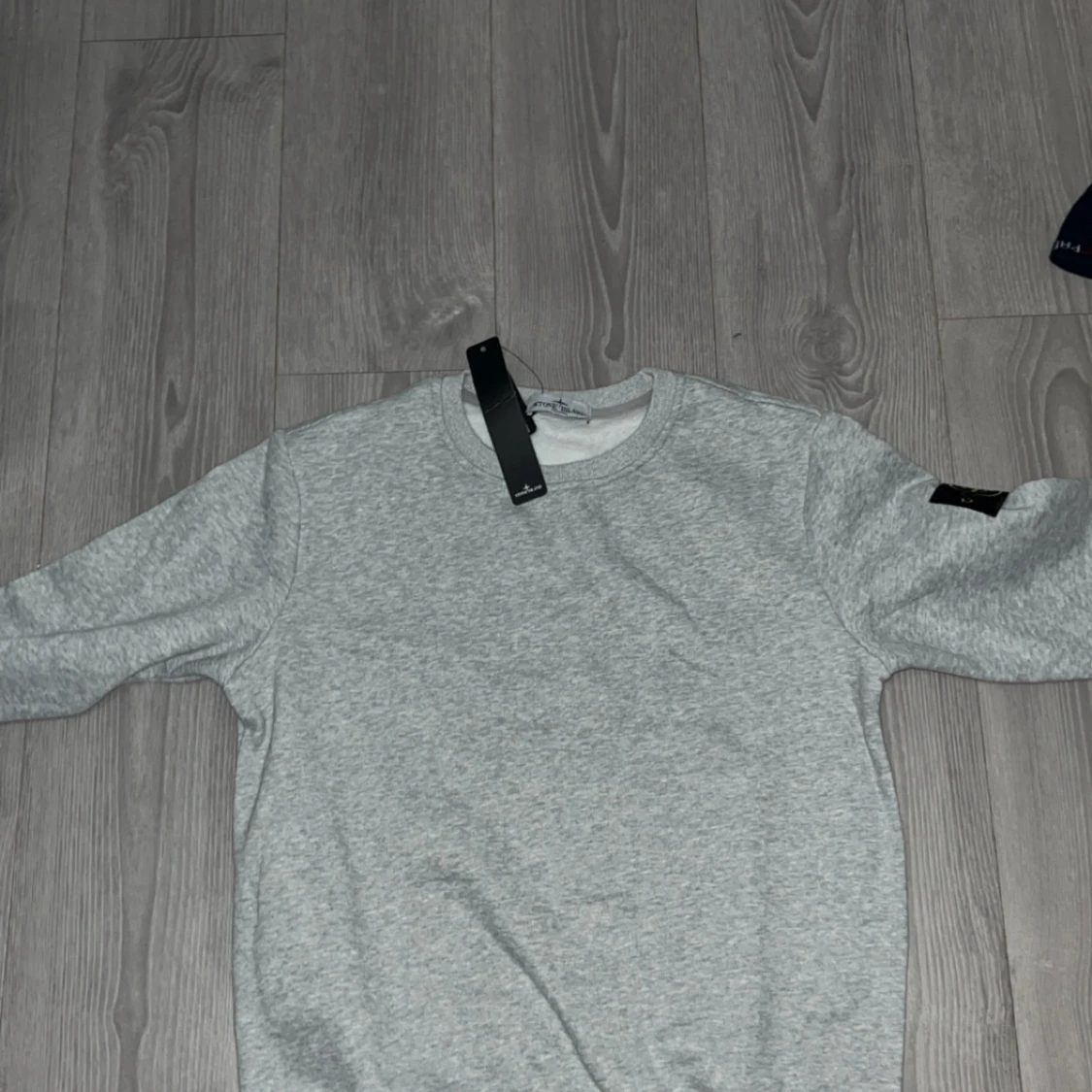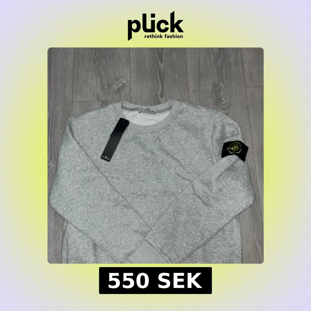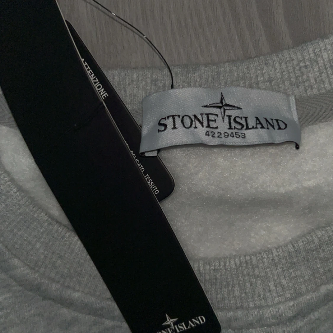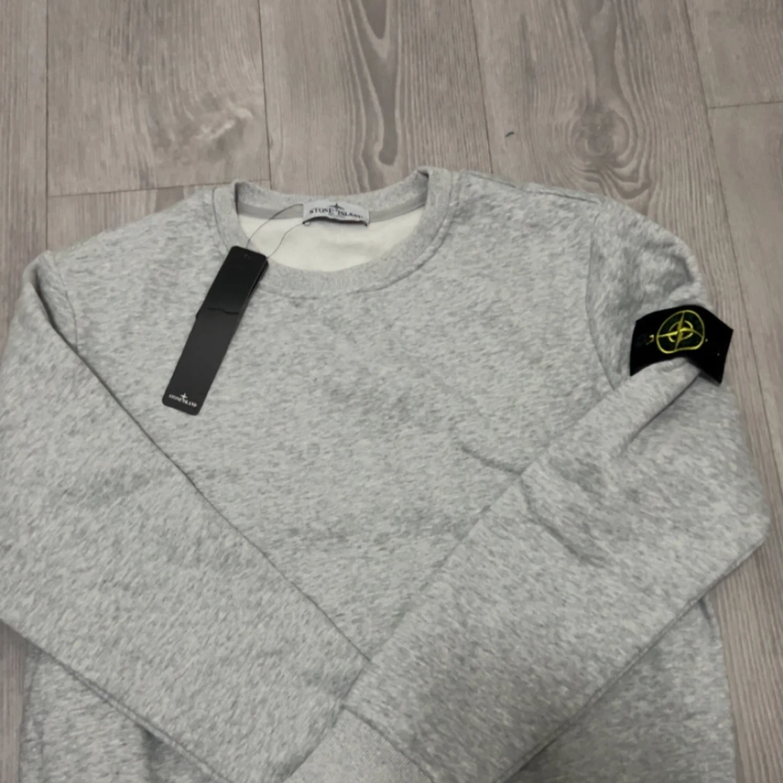 Snygg grå sweatshirt från Stone Island med klassisk logga på ärmen. Tröjan har rund halsringning och långa ärmar. Perfekt för dig som gillar stilrena och trendiga plagg. Mjuk och skön bomullskvalitet.