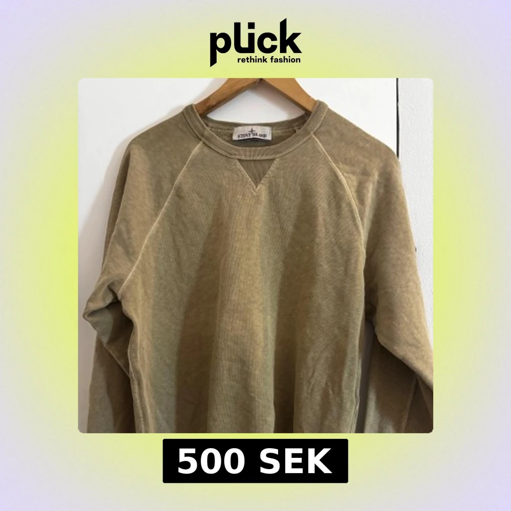 Säljer en snygg beige tröja från Stone Island med rund hals och ribbade detaljer. Tröjan har en ikonisk logga på ärmen och är perfekt för en stilren look.