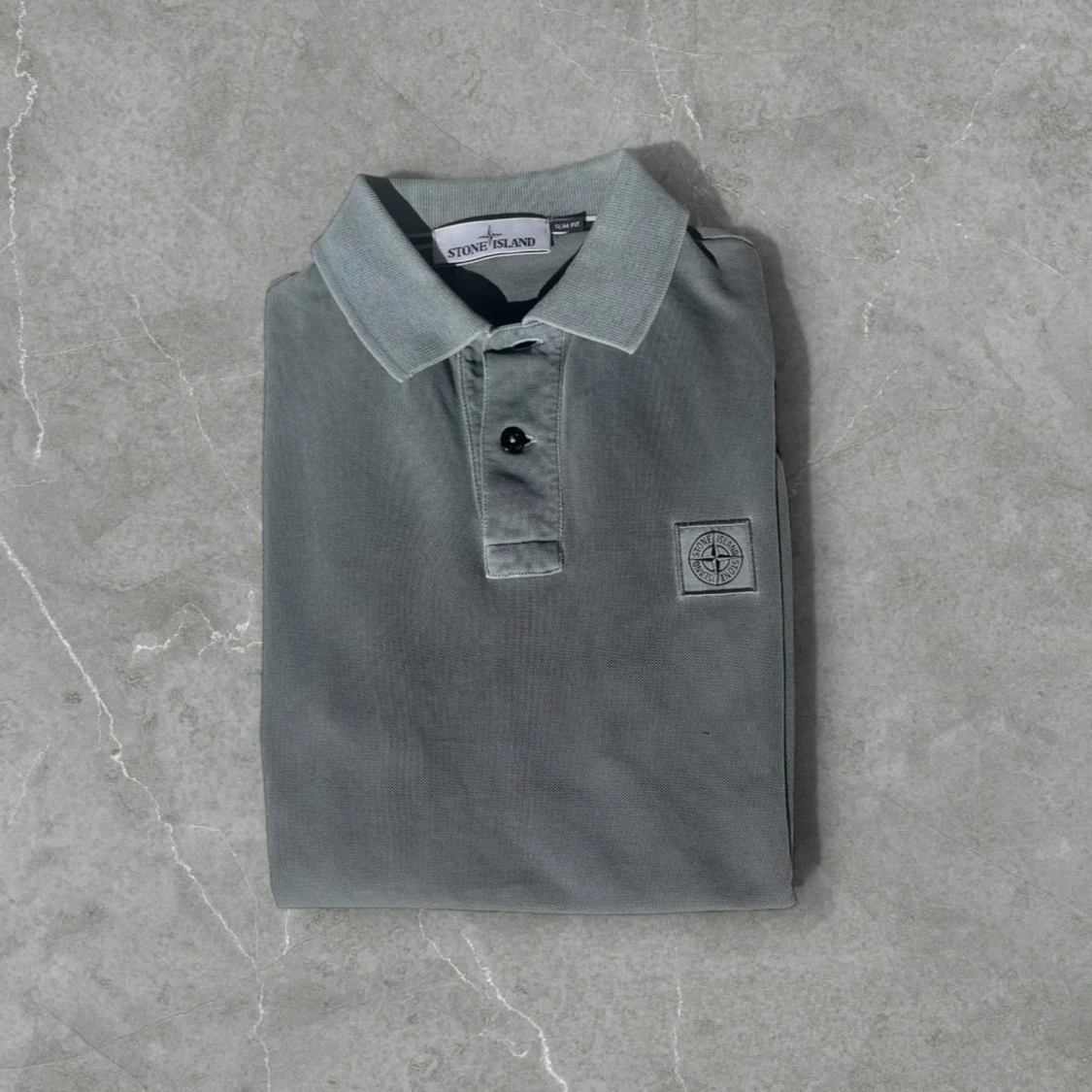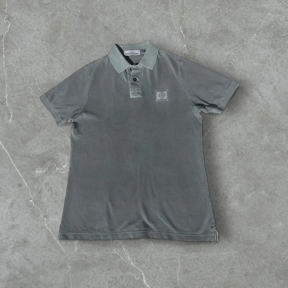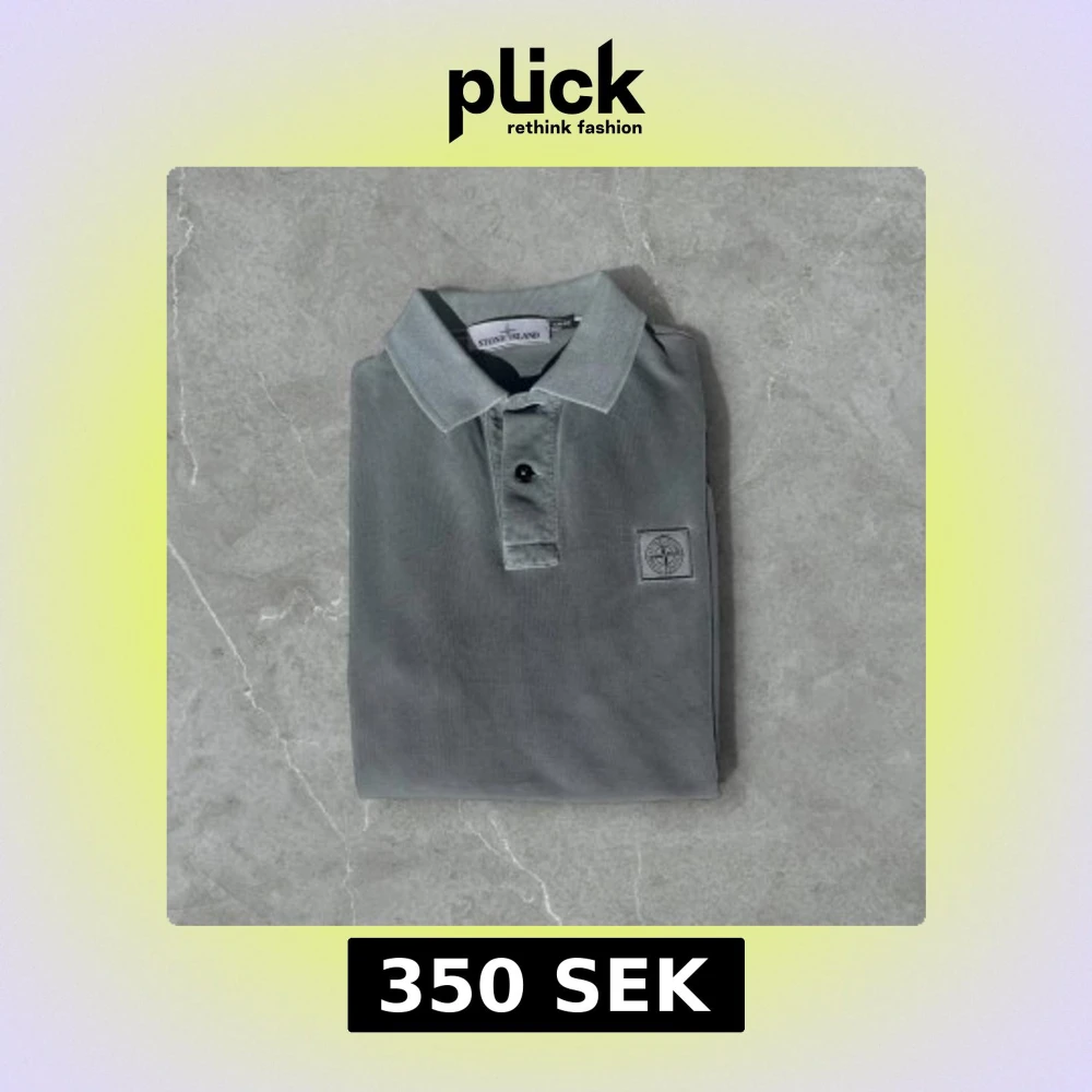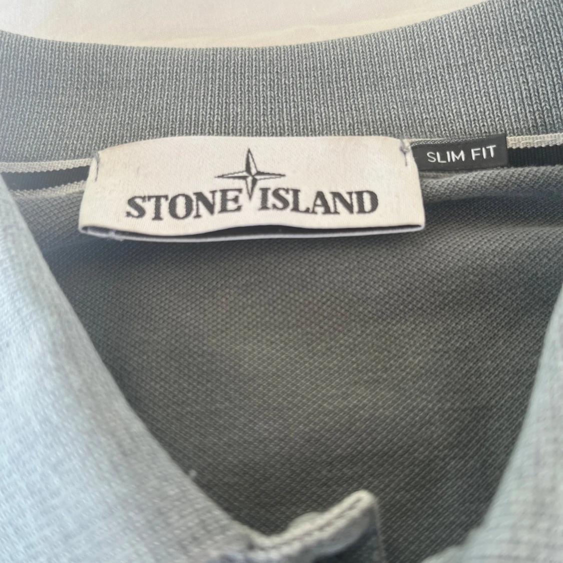 Säljer en stilren grå pikétröja från Stone Island med klassisk krage och två knappar framtill. Tröjan har en diskret logotyp på bröstet och är i slim fit-modell. Perfekt för dig som gillar en clean och enkel look.