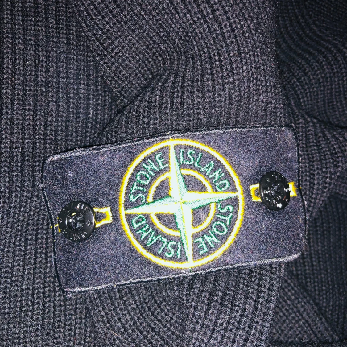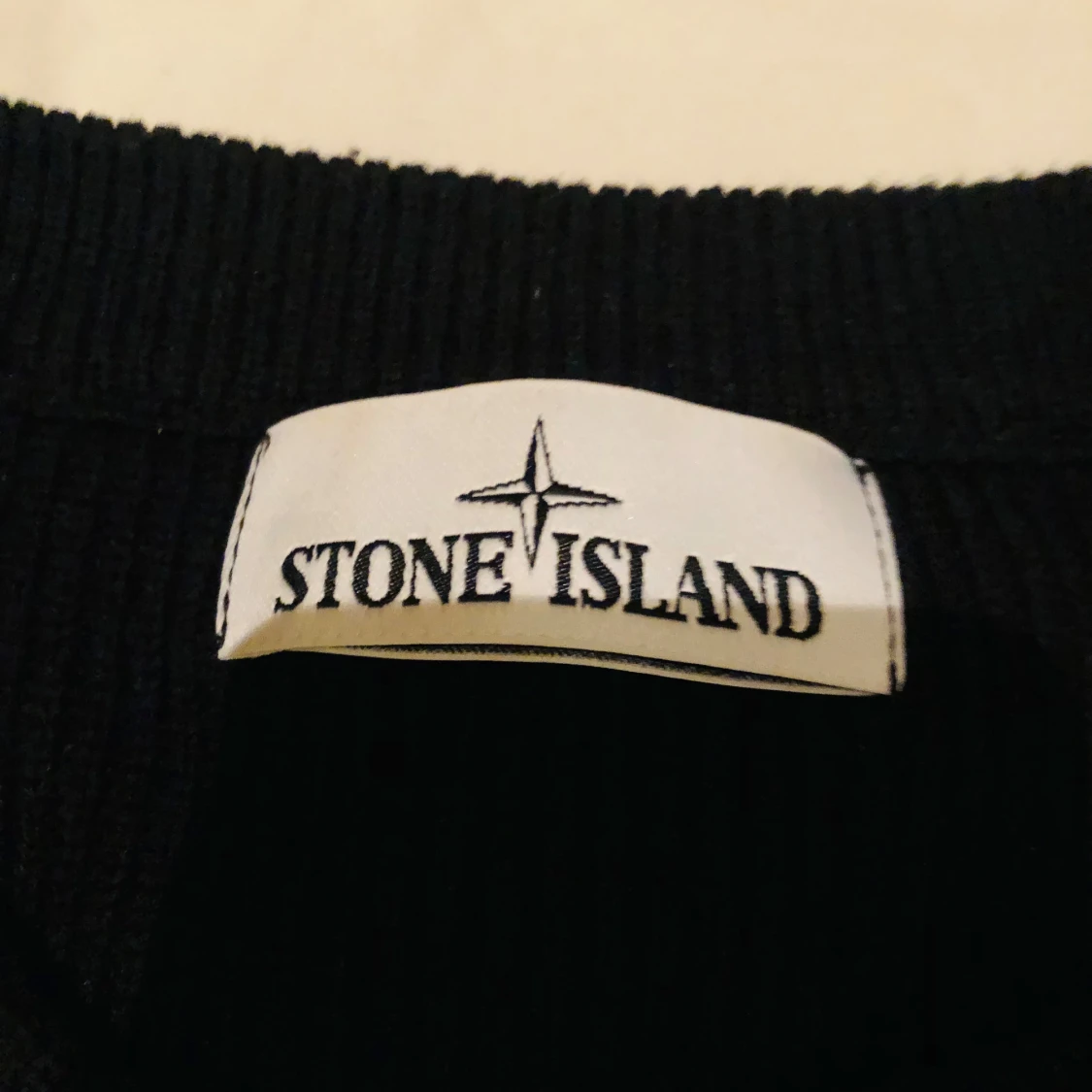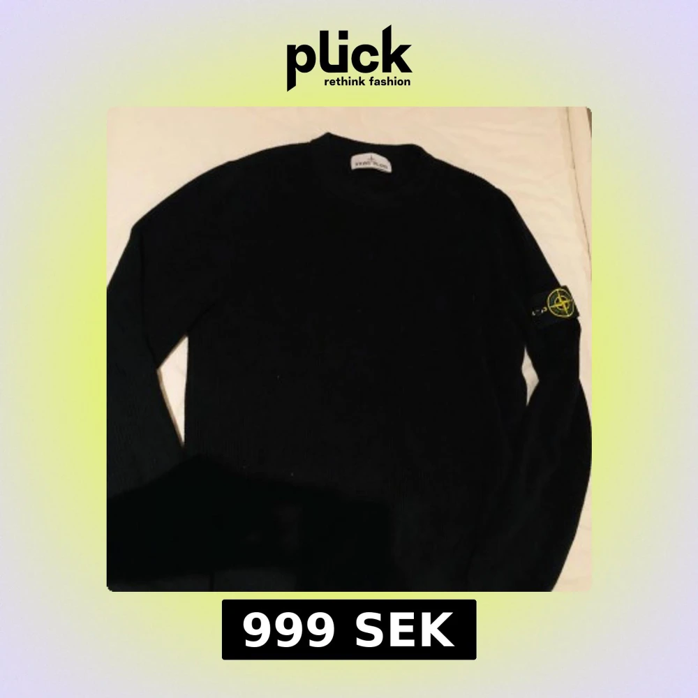 Säljer en stilren svart tröja från Stone Island med deras ikoniska märke på ärmen. Tröjan har en ribbad struktur och långa ärmar, perfekt för en avslappnad men snygg look.är s men sitter som m