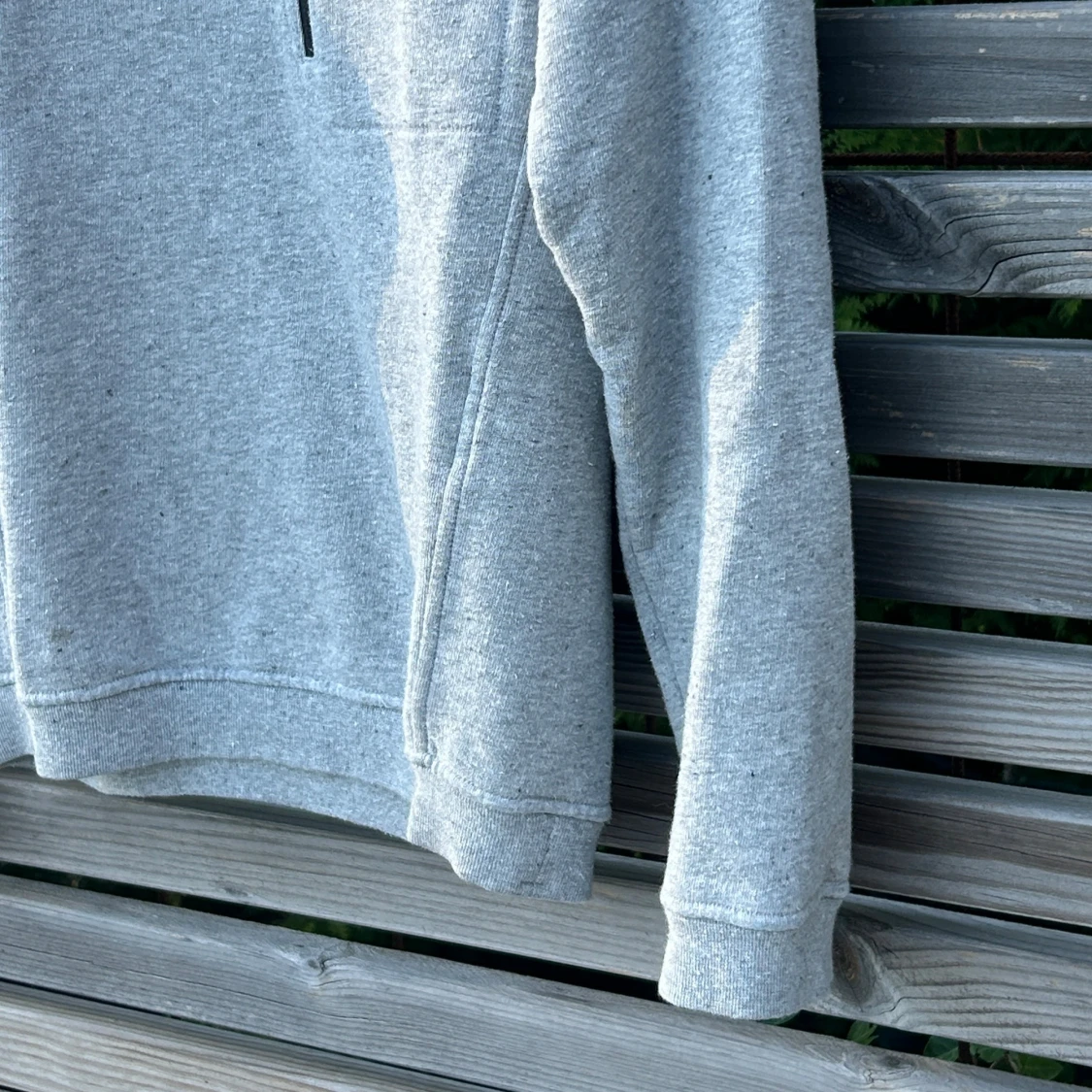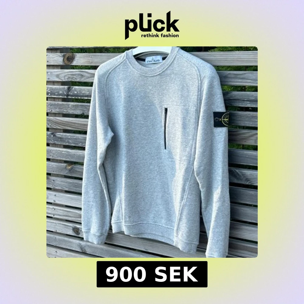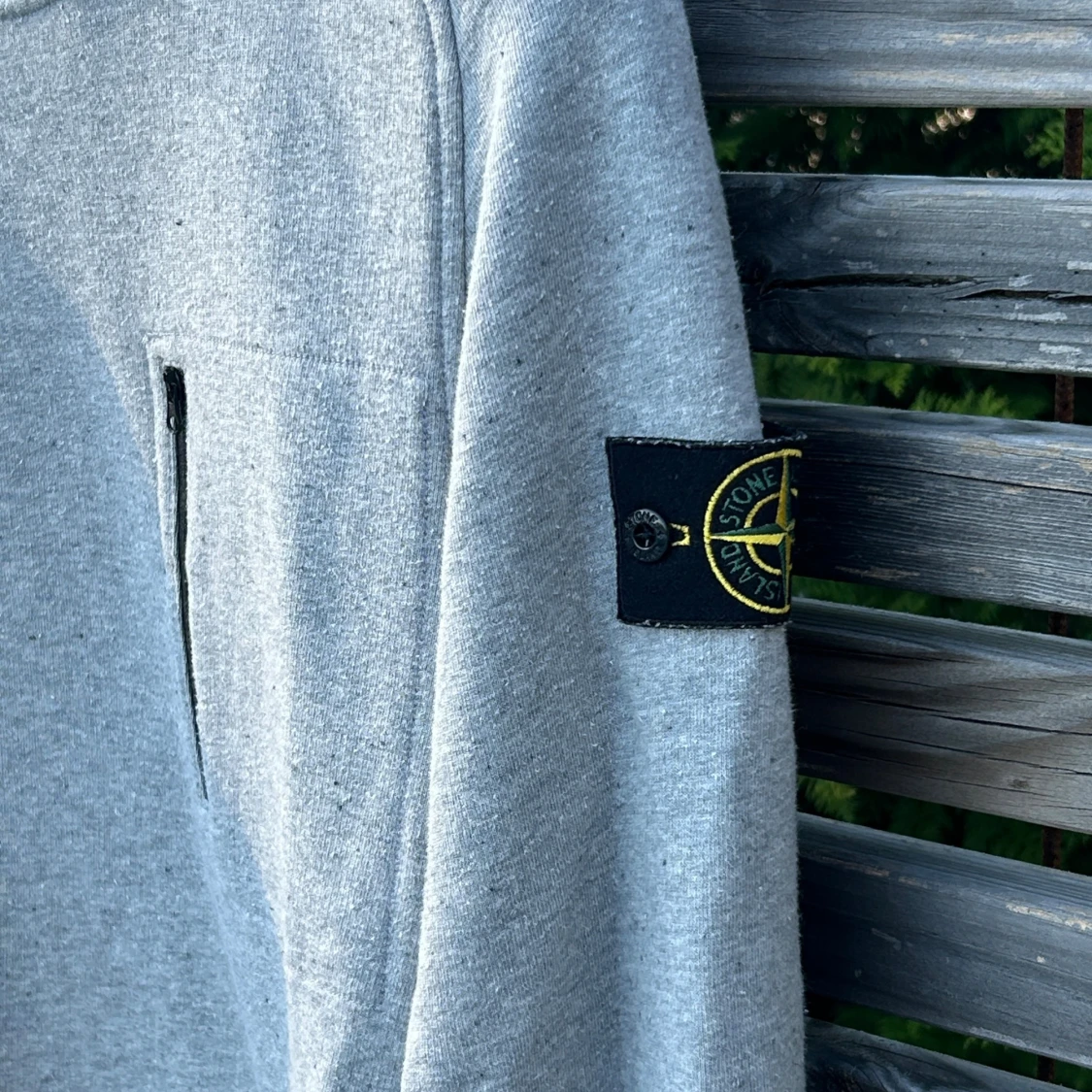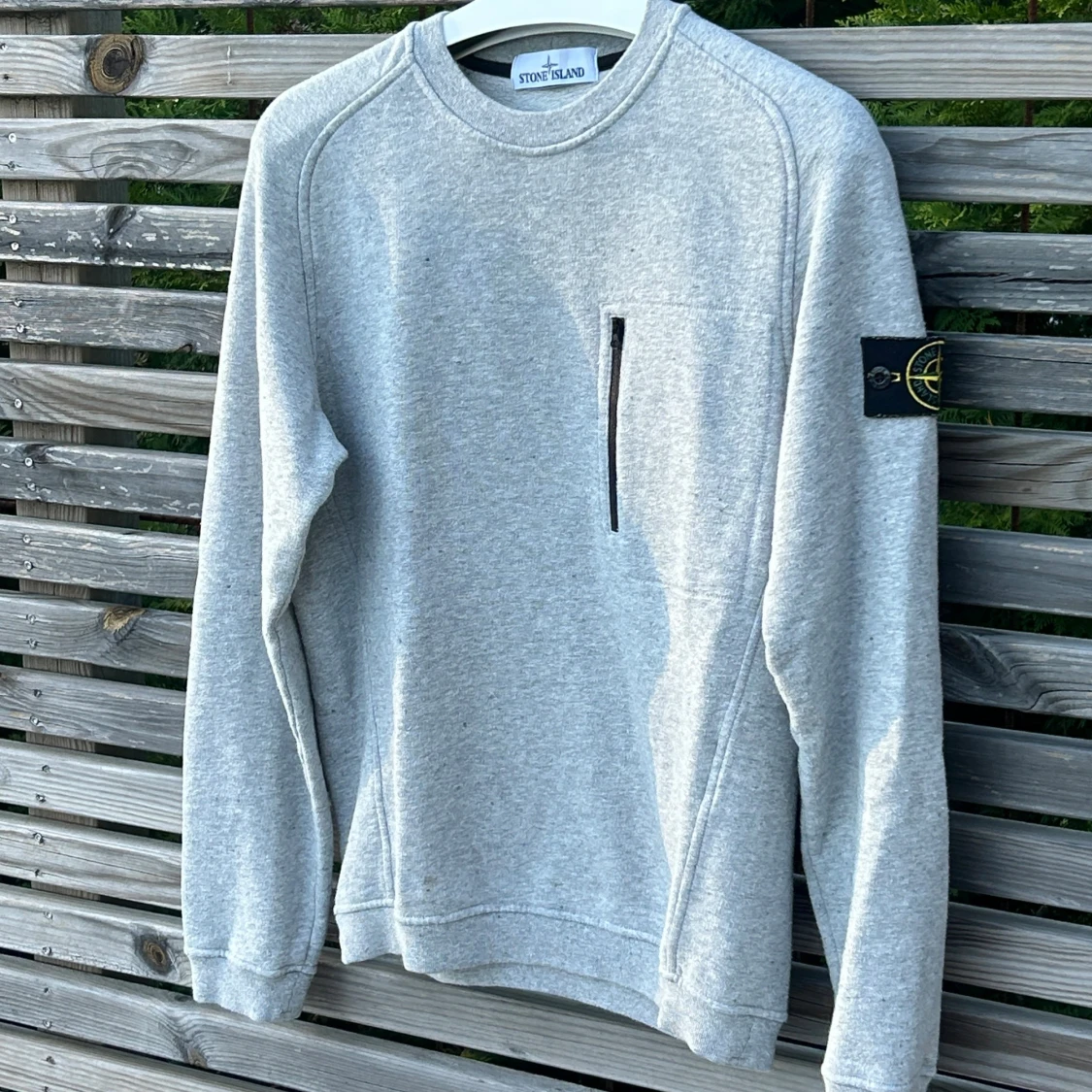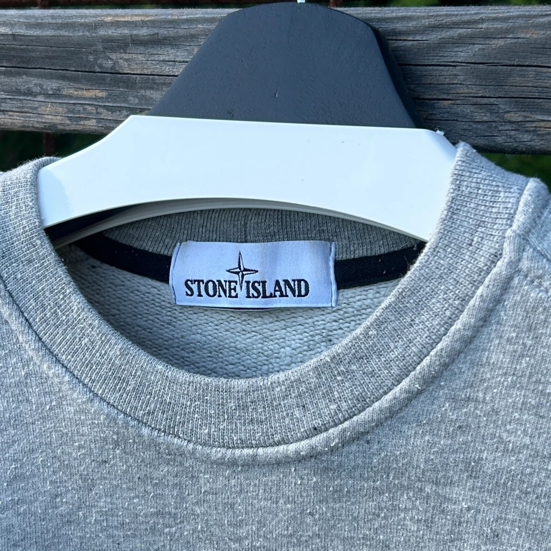 Säljer en grå sweatshirt från Stone Island med klassisk patch på ärmen. Tröjan har rund hals, långa ärmar och är gjord i mjuk bomull. I bra skick 7,5/10