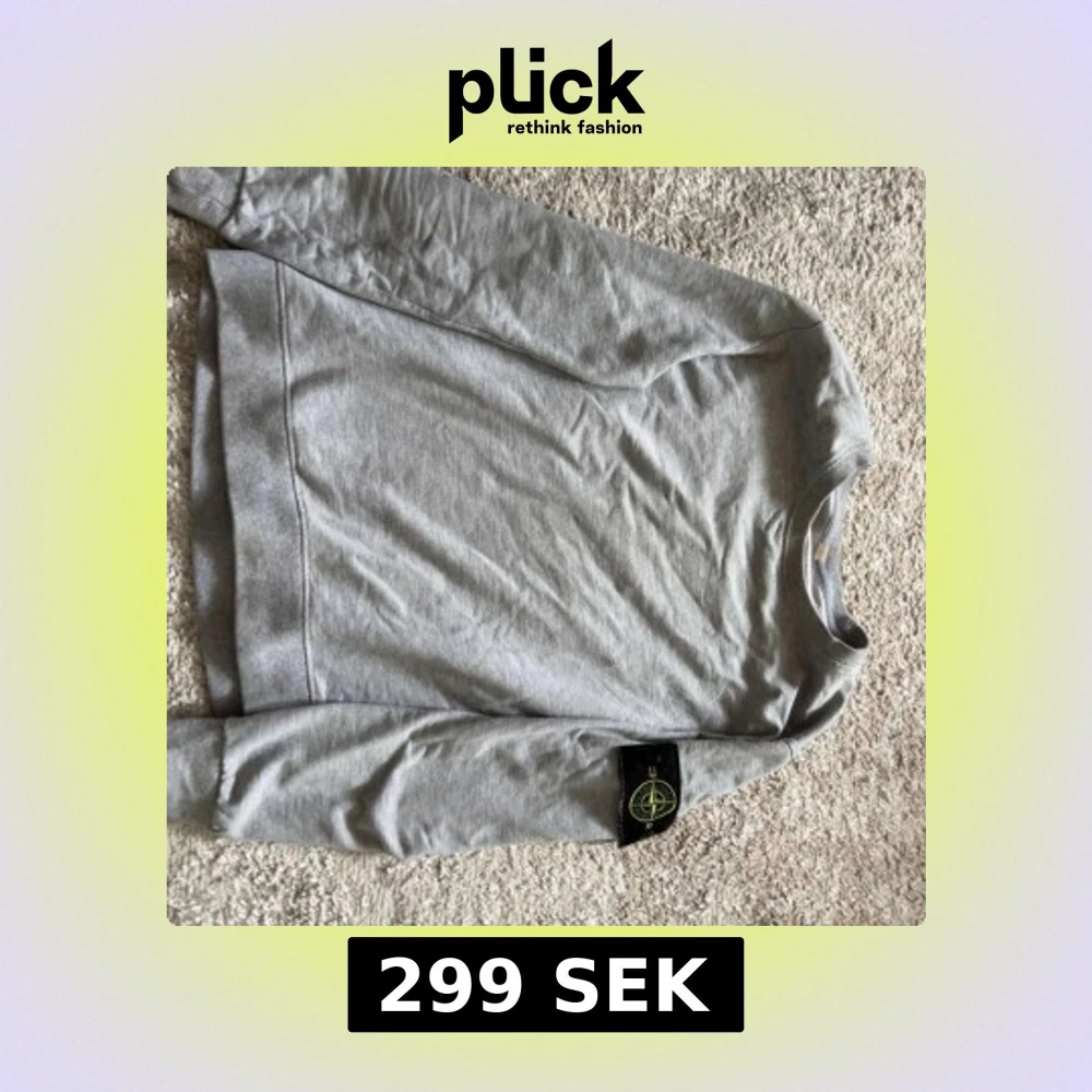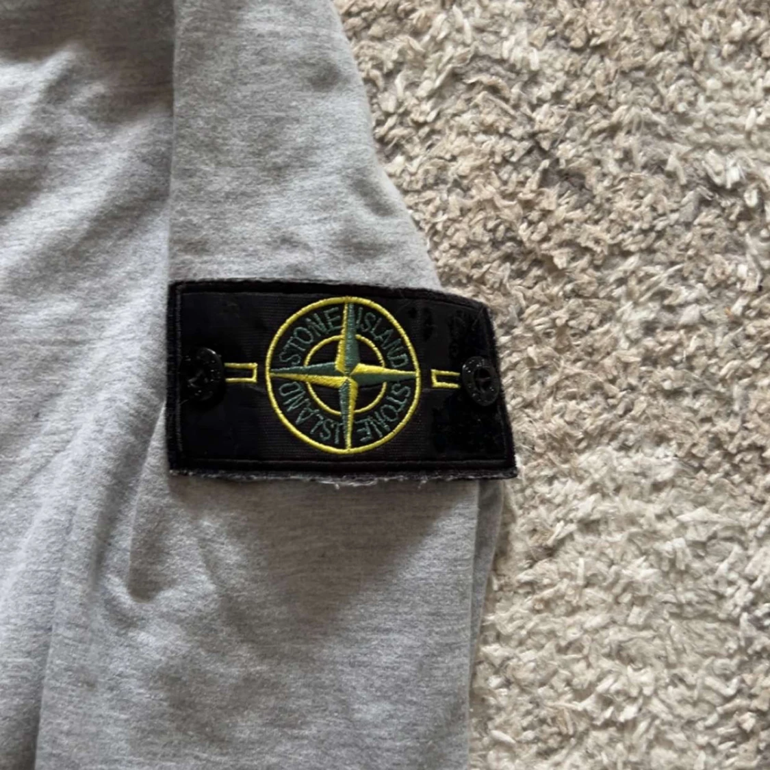 Säljer en grå sweatshirt från Stone Island med klassisk rund hals och ribbade muddar. Tröjan har den ikoniska svarta logotypen med gul brodyr på vänster ärm. Perfekt basic med snygg streetkänsla.