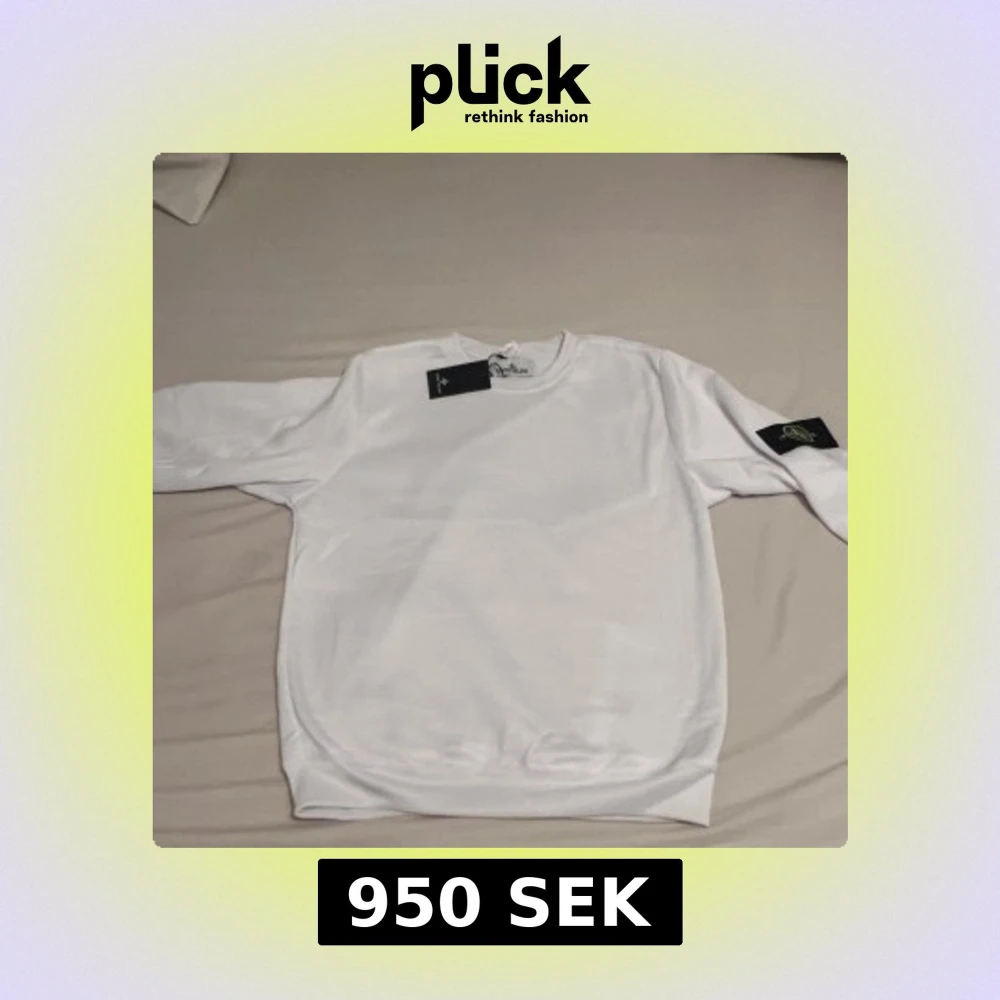 Vit sweatshirt från Stone Island i storlek XL. Klassisk rund hals och långärmad modell med den ikoniska Stone Island-patchen på vänster ärm. Tröjan är gjord i mjuk bomull och har en clean look som passar perfekt till jeans eller cargo.
