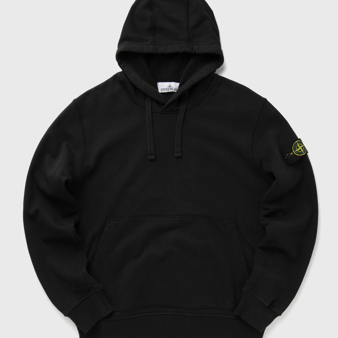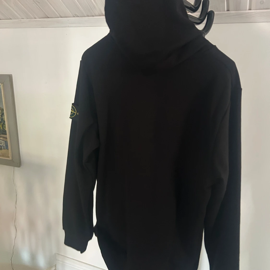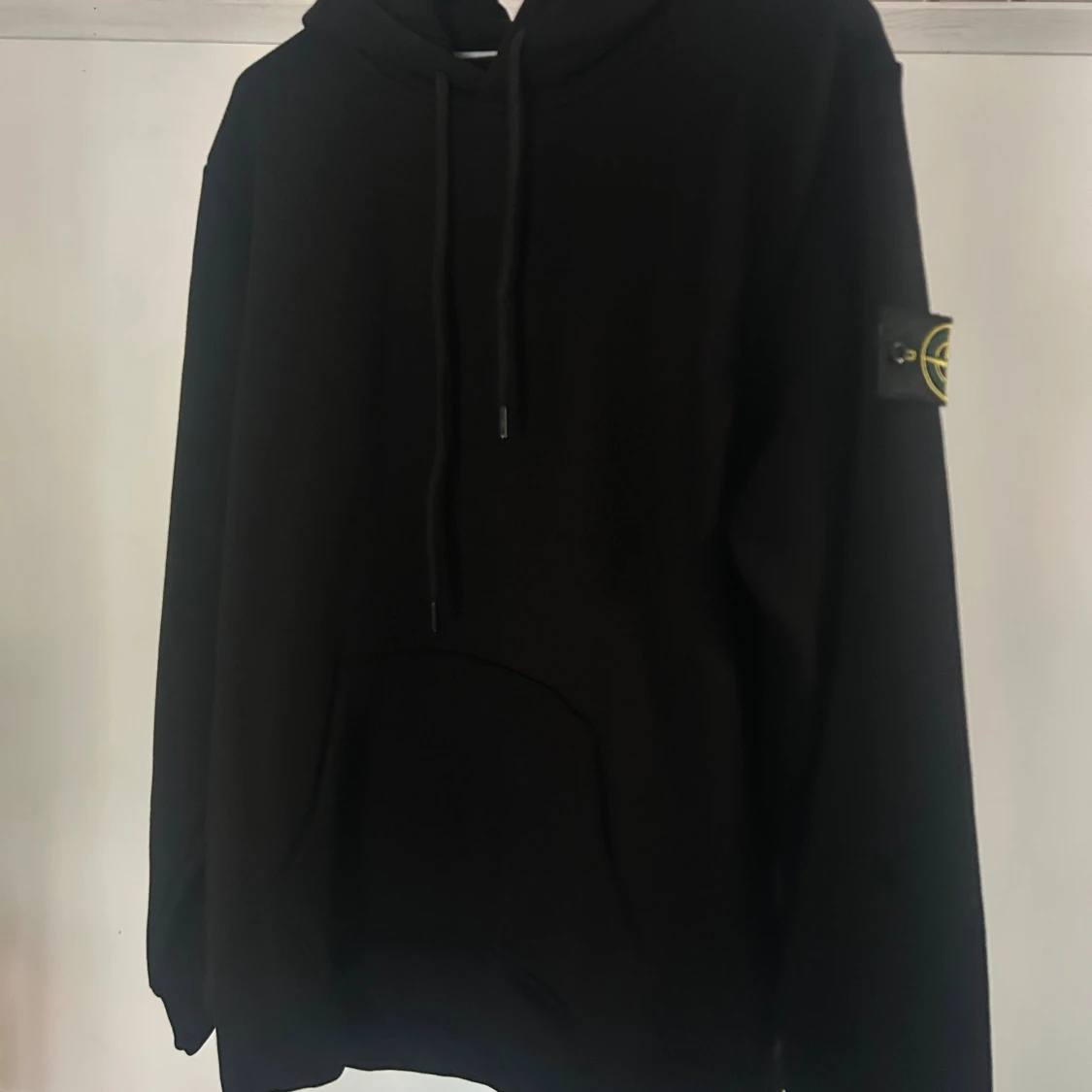 Svart hoodie från Stone Island i storlek M med klassisk logopatch på vänster ärm. Tröjan har huva med snörning, stor magficka och ribbade muddar. Perfekt för dig som gillar streetwear och vill ha en clean look.