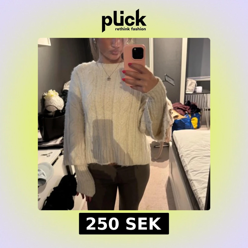 Supermysig vit stickad tröja med trekvarts ärmar över och kabelstickat mönster.