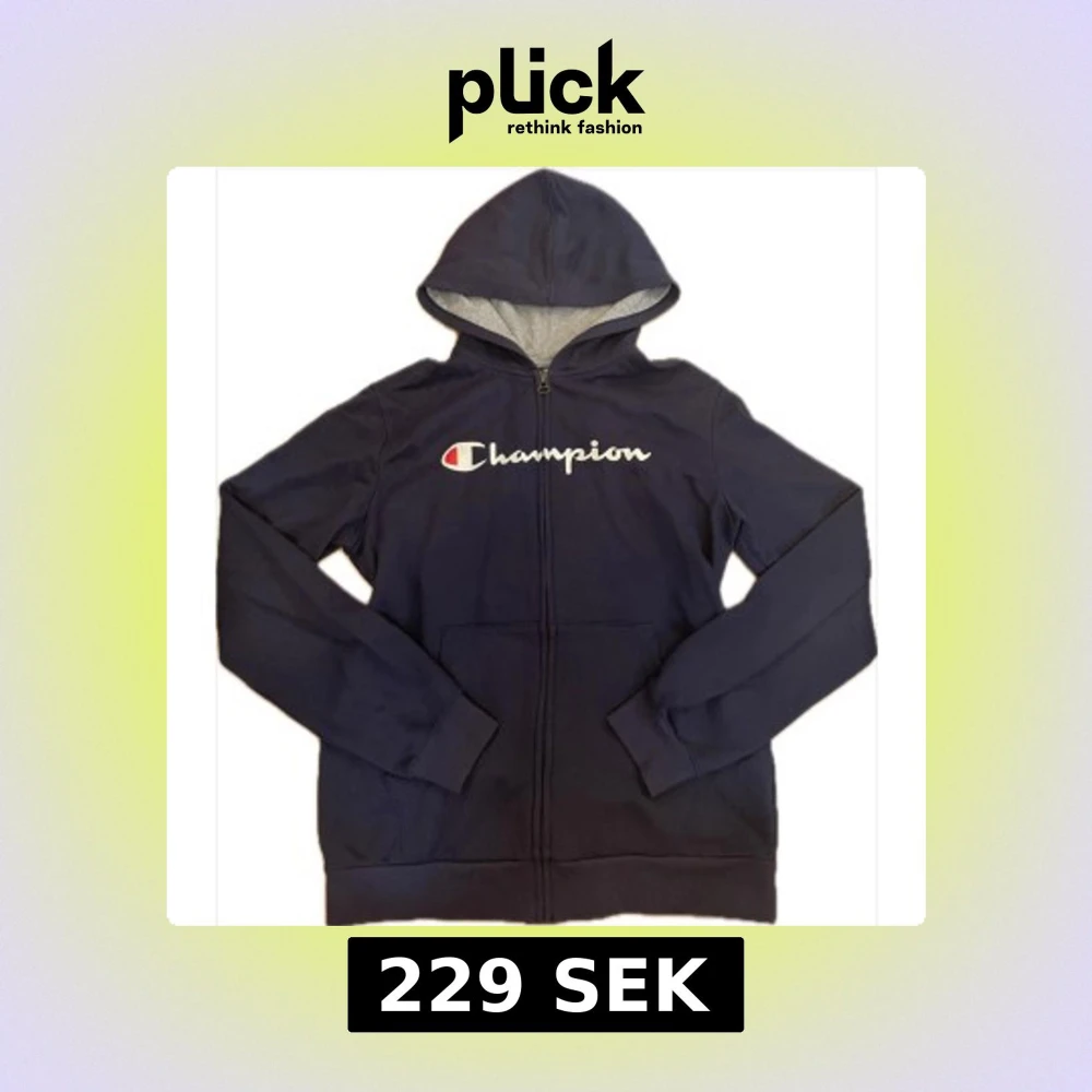 Snygg mörkblå hoodie från Champion med vit logga, dragkedja, huva och fickor framtill. Står storlek XL men passar XS-M.