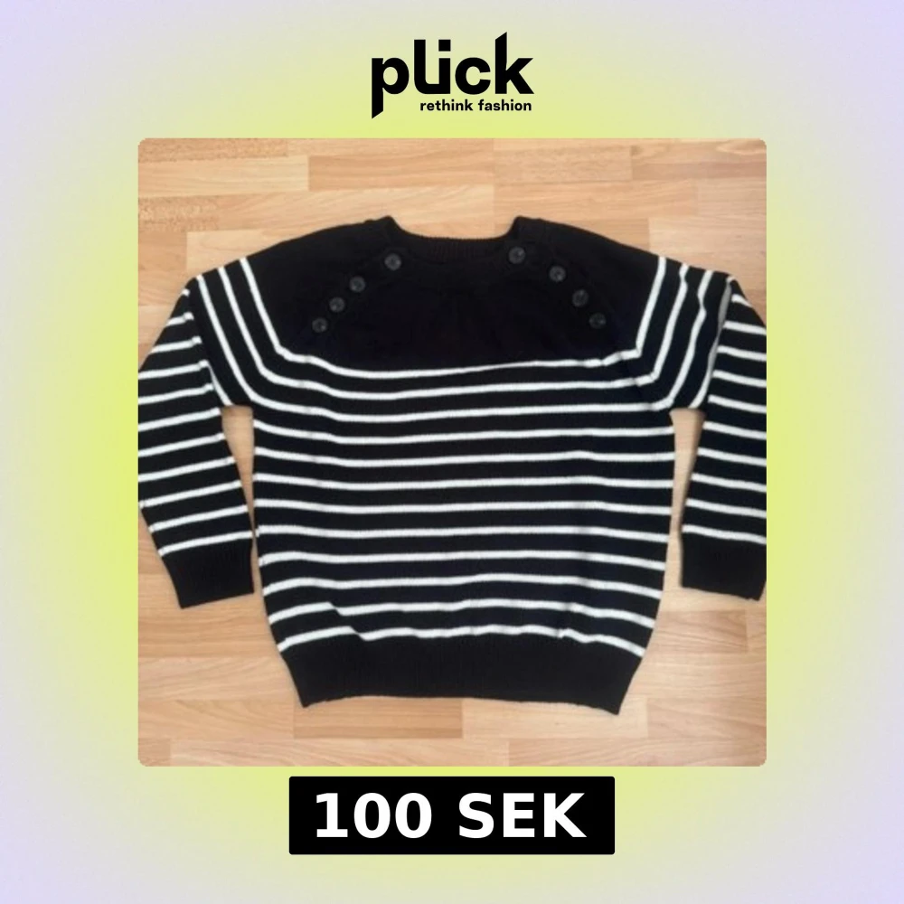 Svart och vit randig stickad tröja i storlek L med snygga knappar på axlarna. Tröjan har rund halsringning, långa ärmar och ribbade muddar. Perfekt för dig som gillar klassisk stil med en twist. Tröjan är bara tvättat för jag tvättar alltid nya plagg, men hade aldrig på mig.