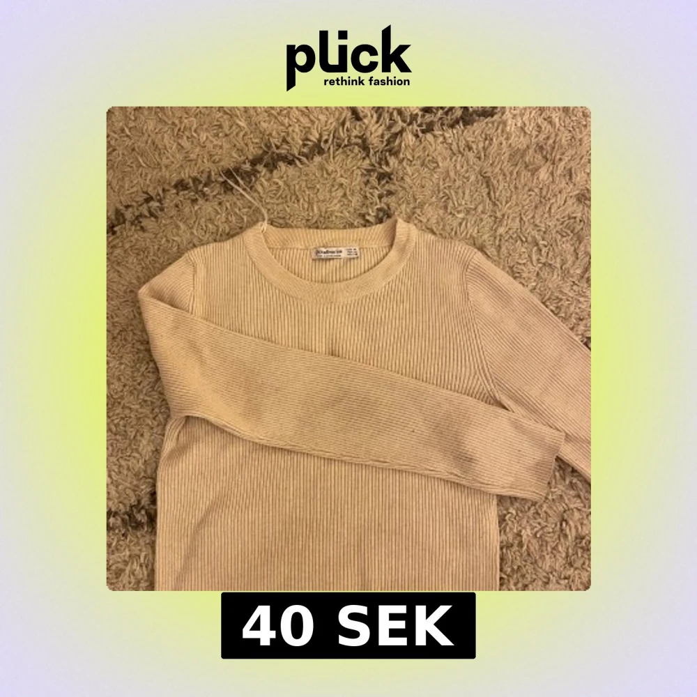 Säljer en beige ribbad tröja från Stradivarius. Tröjan har en rund halsringning och långa ärmar. Storlek M men passar mig i XS! Pris går att diskutera!