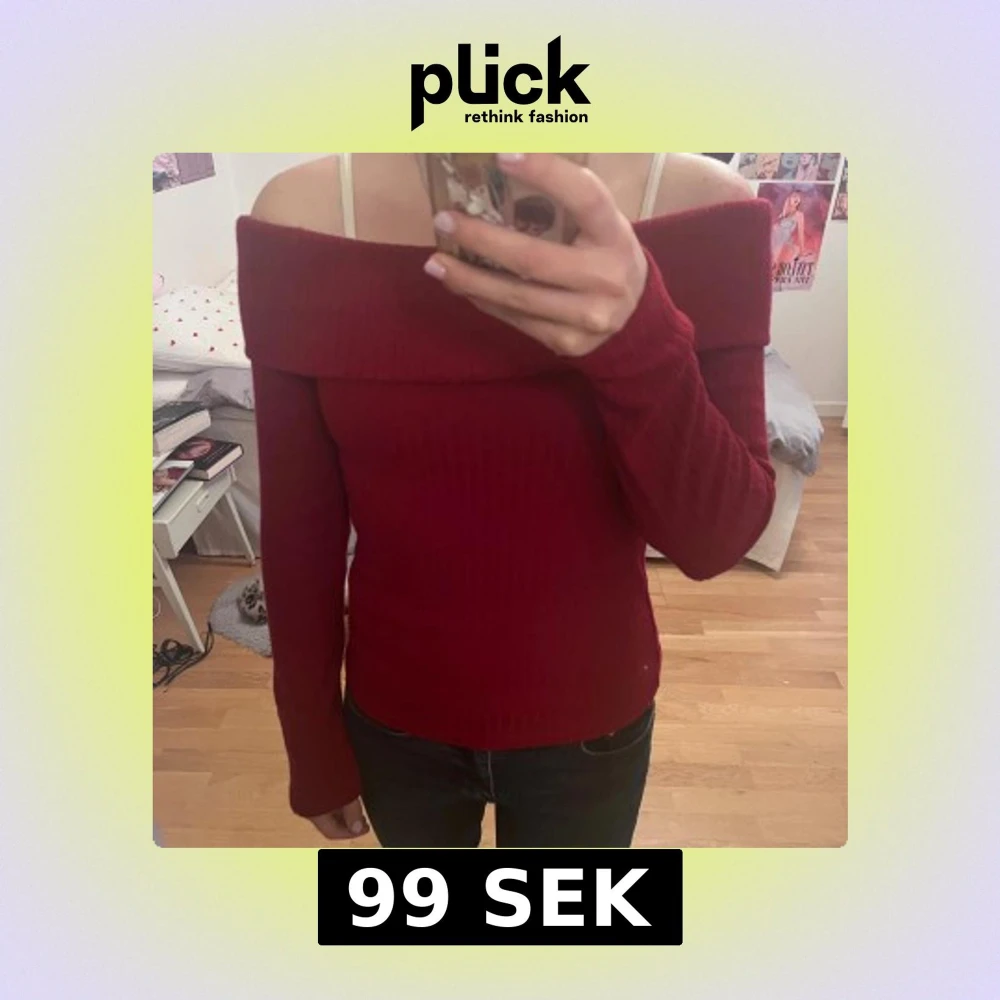 Snygg mörkröd offshoulder tröja med ribbad struktur och långa ärmar. Tröjan har en bred kant upptill och passformen är slim och materialet känns mjukt och stretchigt. Är storlek S men passar också XS