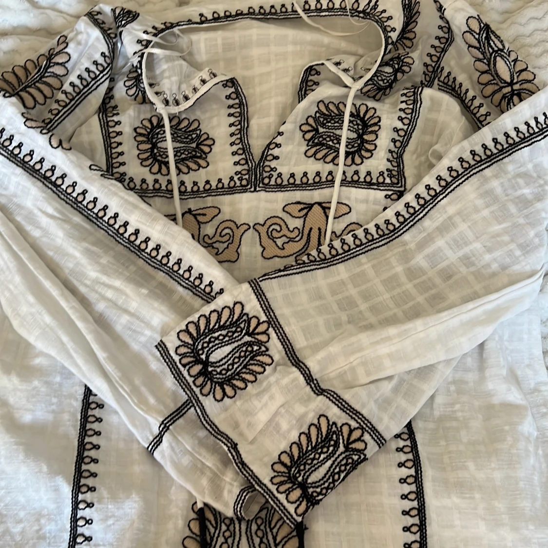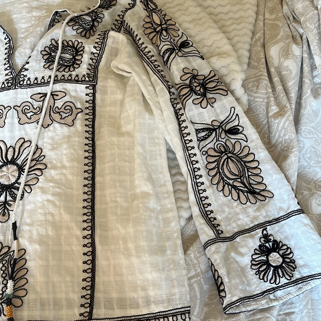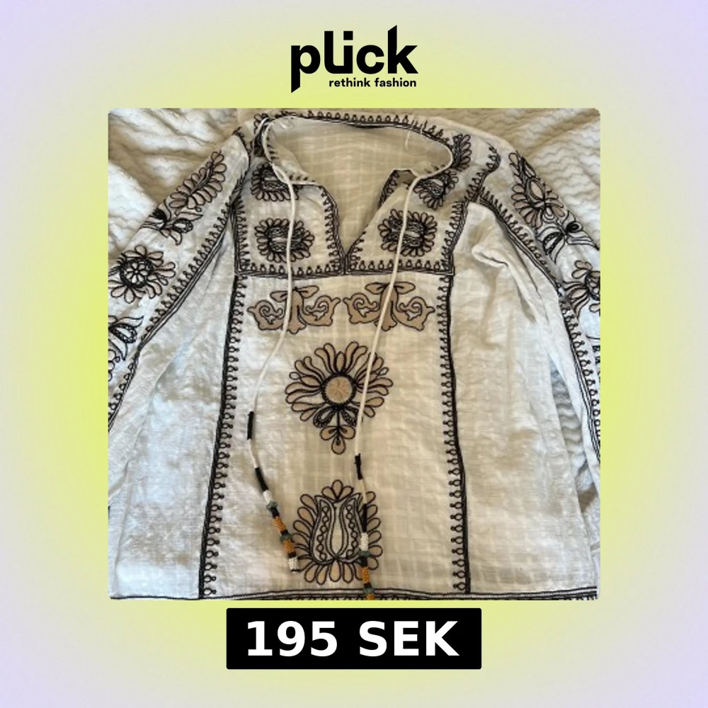 Säljer en superfin vit kort klänning från Zara med detaljerade svarta broderier. Den har en v-ringad design med snörning och pärlor i svart, vitt och orange. Perfekt inför sommar med sina långa ärmar och luftiga material. 🙌🏼🍓