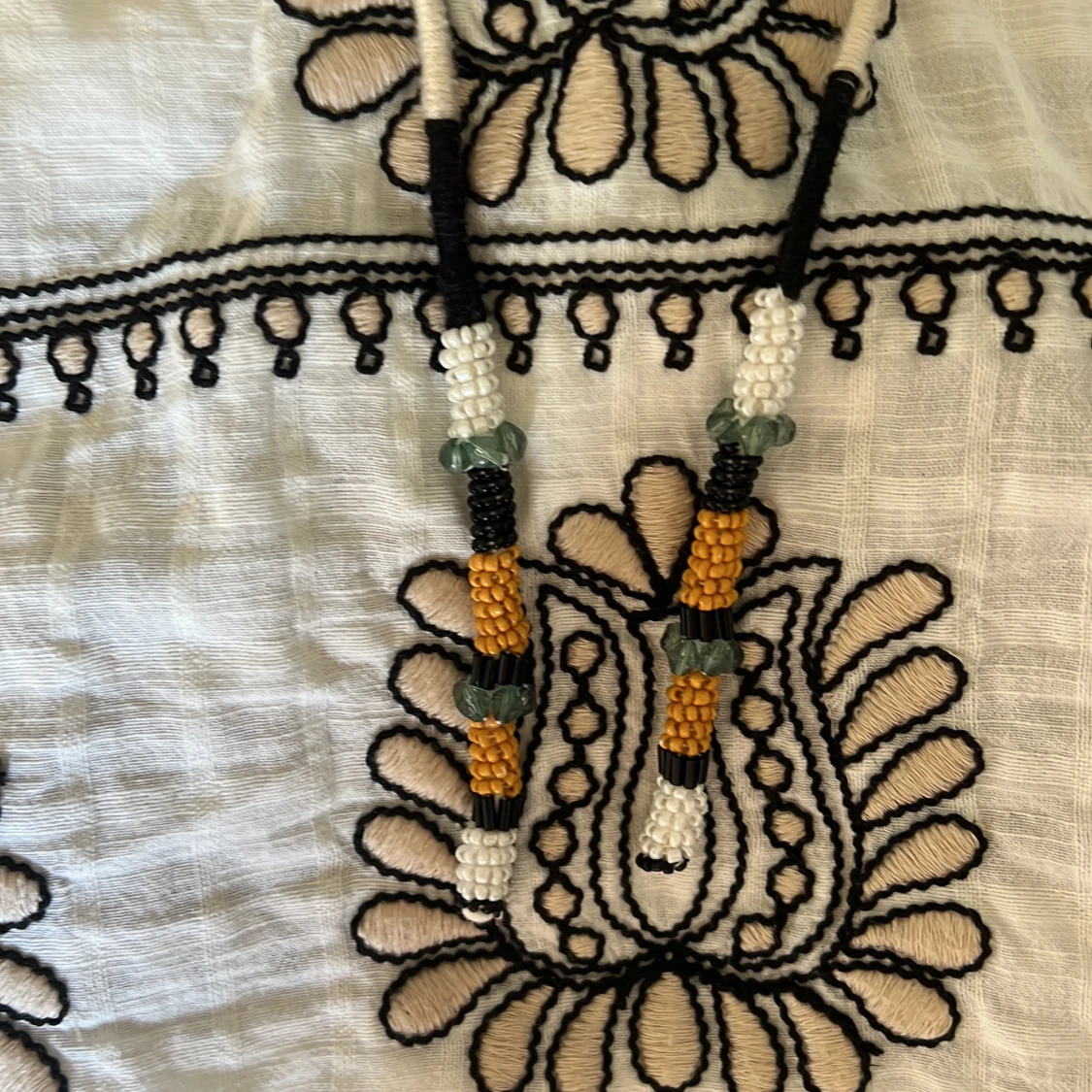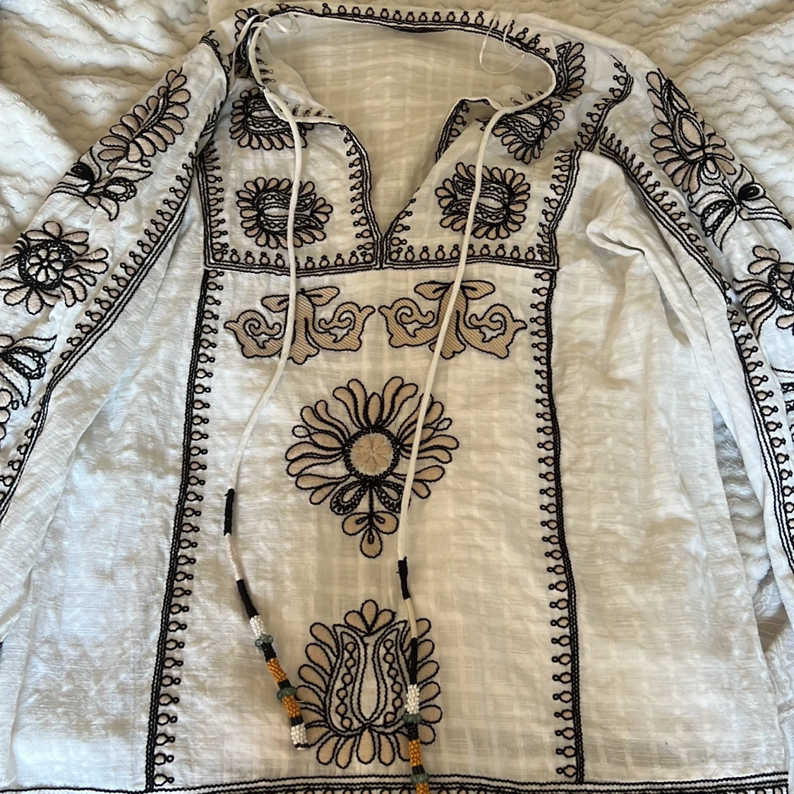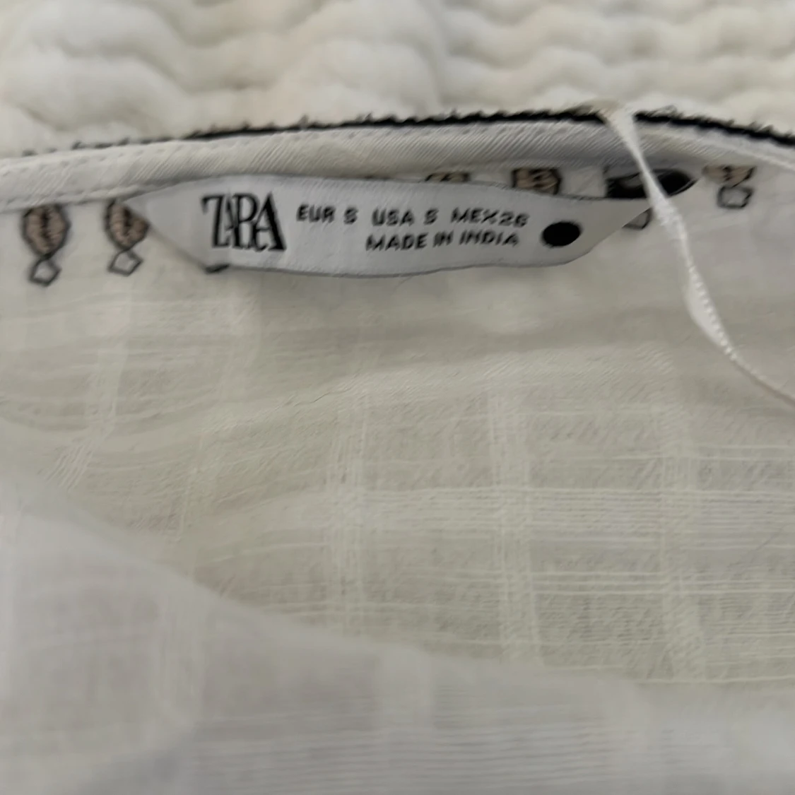 Säljer en superfin vit kort klänning från Zara med detaljerade svarta broderier. Den har en v-ringad design med snörning och pärlor i svart, vitt och orange. Perfekt inför sommar med sina långa ärmar och luftiga material. 🙌🏼🍓