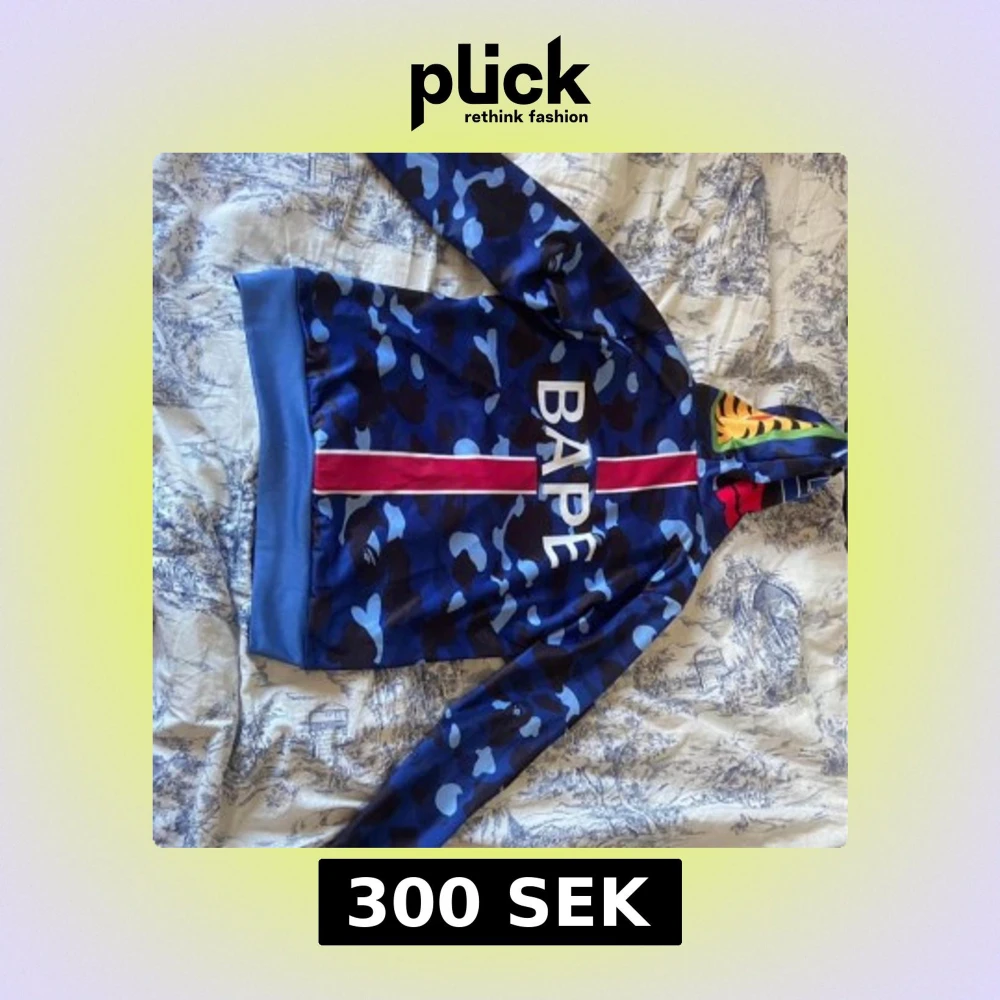 Säljer en blå camo hoodie från BAPE med shark-trycket på huvan och stora BAPE-loggan framtill. Hoodien har dragkedja, huva med färgglada detaljer och är tillverkad i mjukt material.