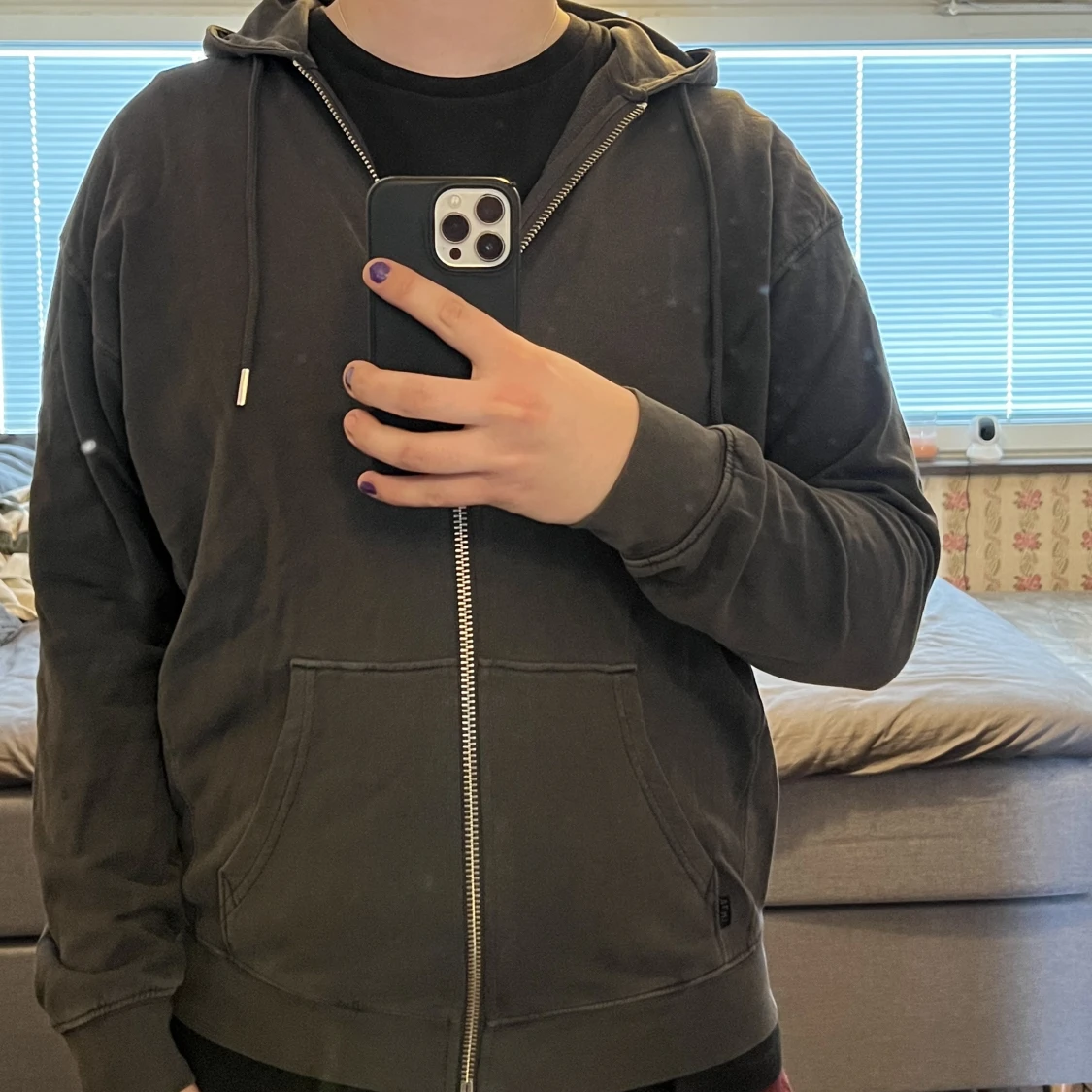 Grafitgrå zip. Ykk dragkedja som känns ovanligt robust och bra kavlité (imo). OBS: Orange textruta i höger nederkant på ryggen. Pm för frågor eller fler bilder!:)