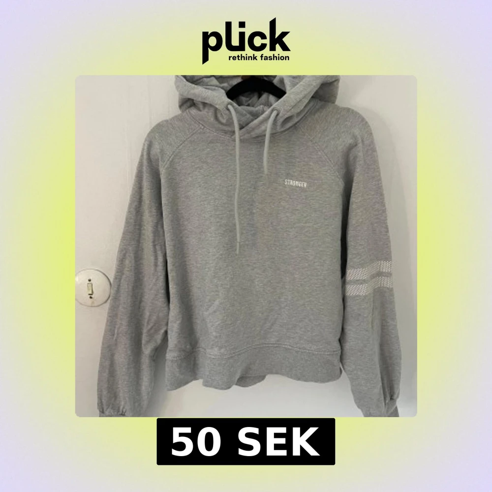 Säljer en grå hoodie från Stronger med vit logga på bröstet och dekorativa vita ränder på ena ärmen. Tröjan har huva med dragsko och en liten slits vid ärmslutet. Perfekt för en avslappnad stil.