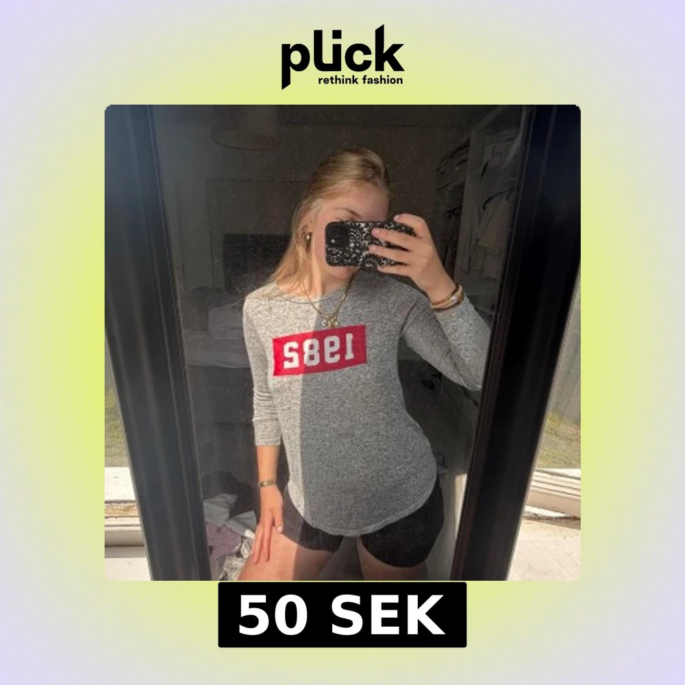 Säljer en grå långärmad tröja från Gina Tricot med rött och vitt tryck '1985' på bröstet. Tröjan är i väldigt mjuktt material