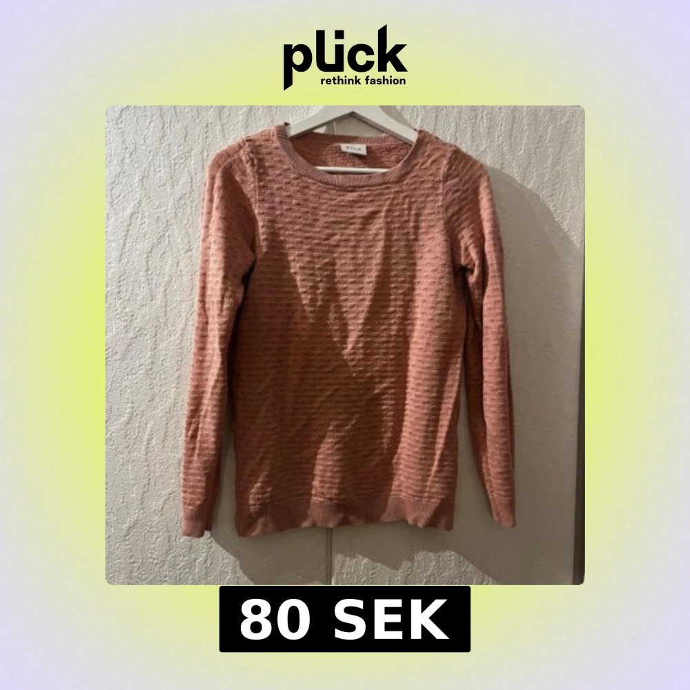 Mysig rosa stickad tröja från Vila i storlek S. Tröjan har ett diskret strukturerat mönster, rund halsringning och långa ärmar. Perfekt för lager-på-lager och passar till både jeans och kjol.