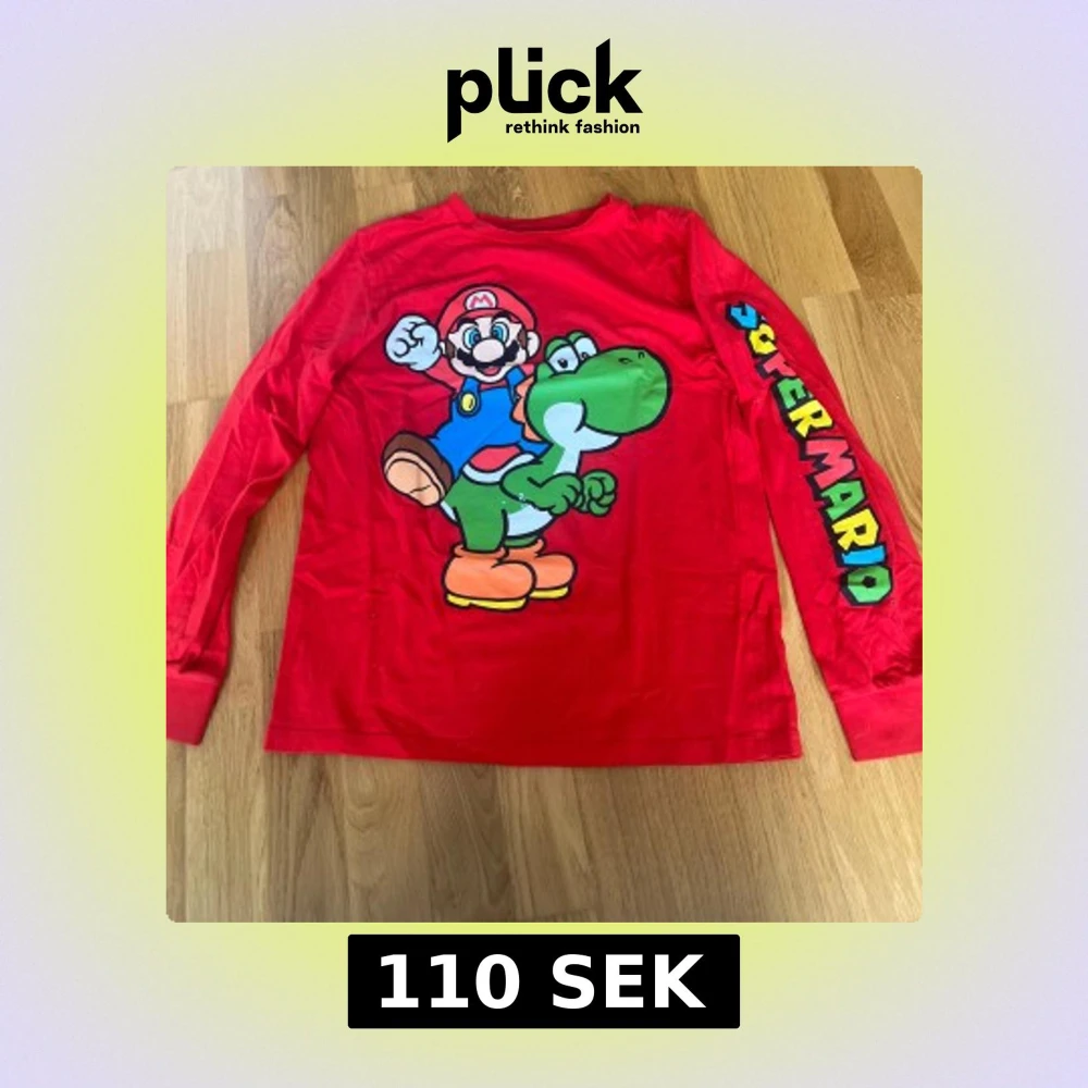 Röd långärmad Super Mario-tröja från Nintendo med stort tryck av Mario och Yoshi på framsidan. Ärmen har färgglad 'Super Mario'-text. Tillverkad i mjuk bomull, perfekt för dig som älskar gaming och vill sticka ut med en färgstark look.