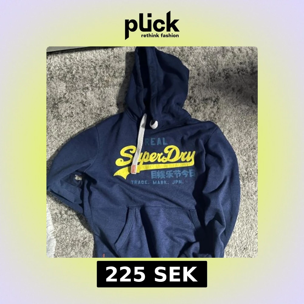 Säljer en blå hoodie från Superdry med gul och blå text på framsidan. Tröjan har en justerbar huva med vita snören och en stor ficka framtill. Perfekt för en avslappnad stil.
