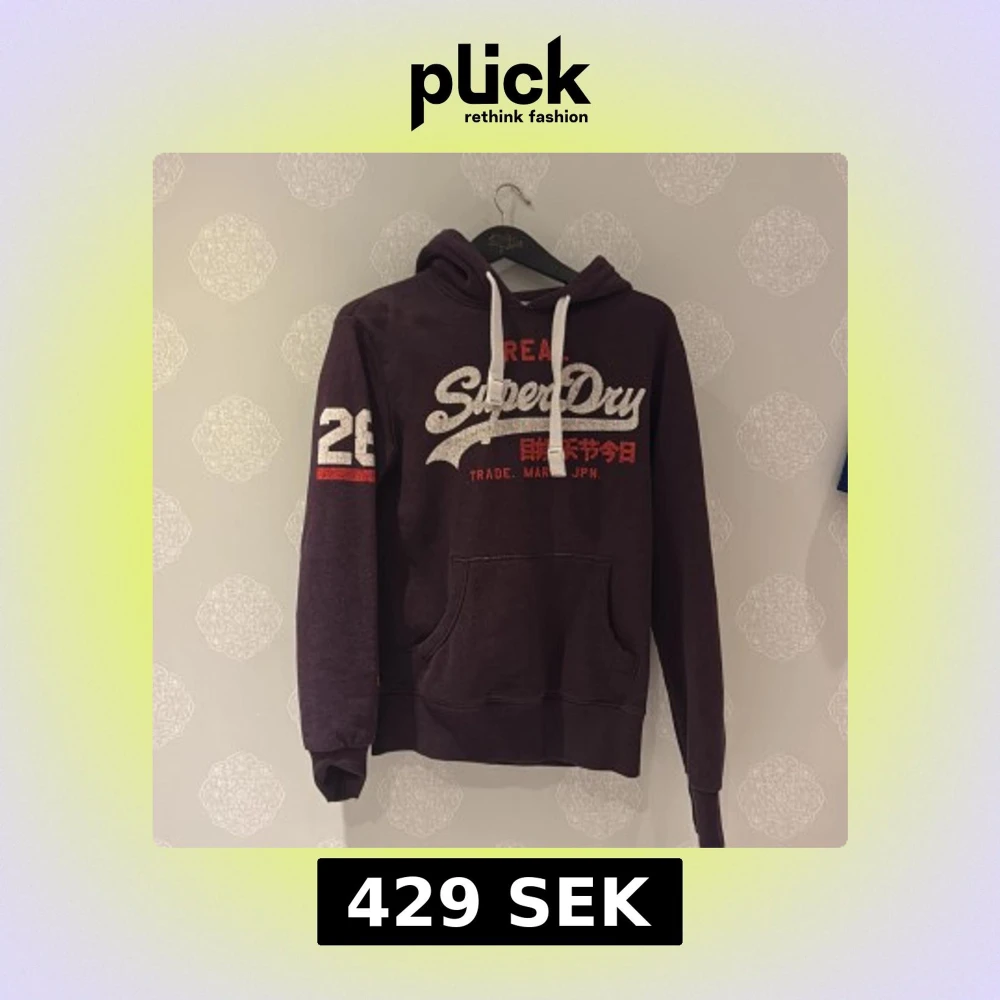 Snygg mörkröd hoodie från Superdry med stort vitt och rött tryck på bröstet och siffran 28 på ärmen. Tröjan har huva med vita snören och en klassisk magficka. Perfekt för dig som gillar streetwear och sportig stil.