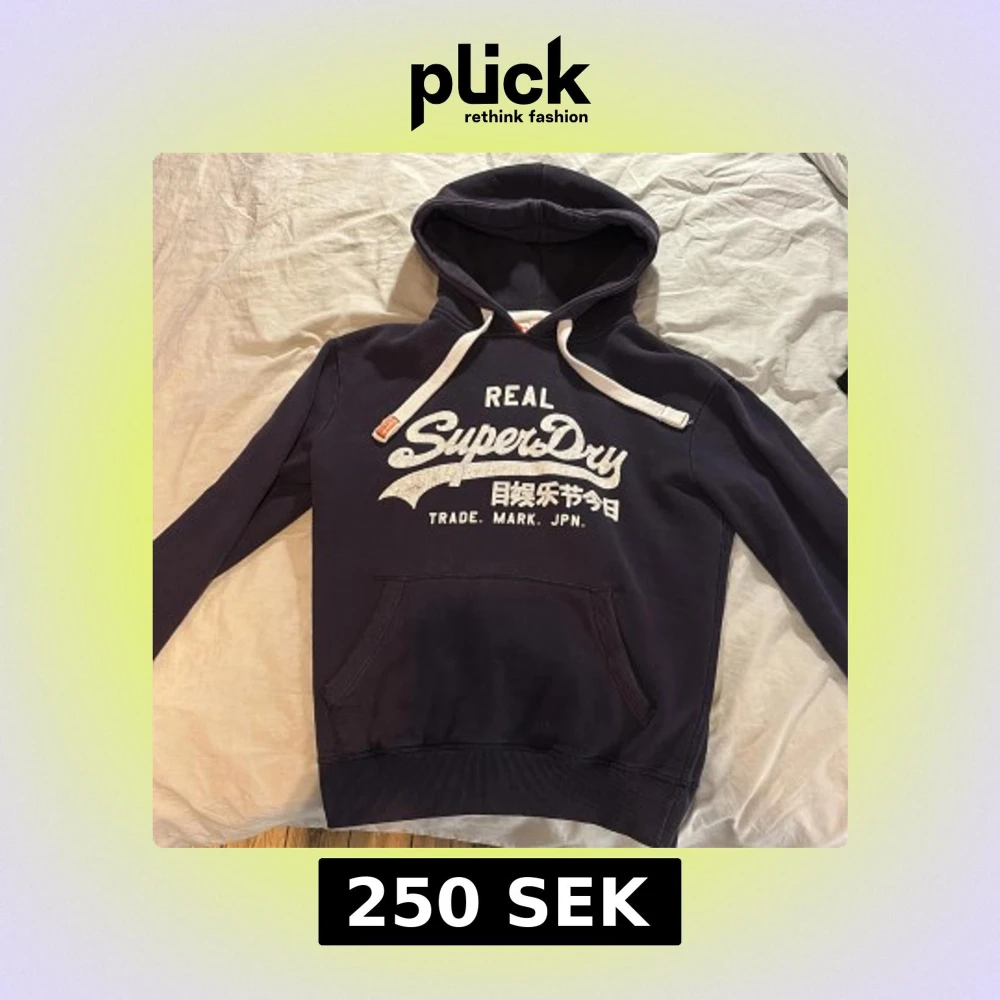 Säljer en mörkblå hoodie från Superdry med vit logga och text framtill. Tröjan har huva med vita dragsnören och en stor magficka. Perfekt för dig som gillar en avslappnad och sportig stil.