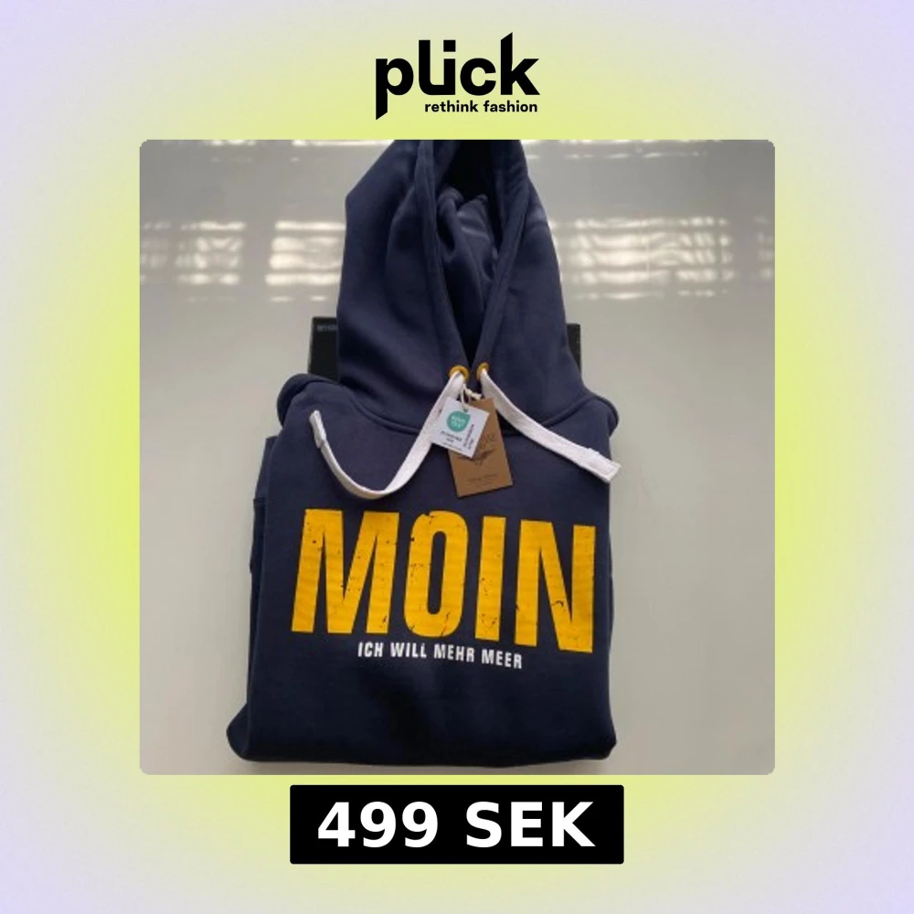 Snygg mörkblå hoodie från EHT2NINE med stor gul MOIN-print och vit text på bröstet. Tröjan har vit snörning i huvan, gul detalj vid snörhål och en praktisk magficka. Tillverkad i mjuk bomull, perfekt för chill dagar. Storlek M. Köptes för ca 700kr