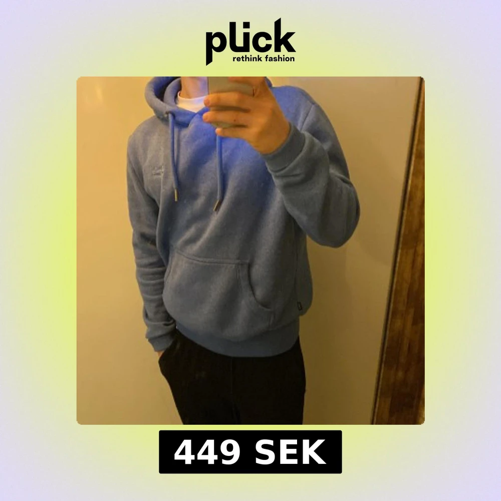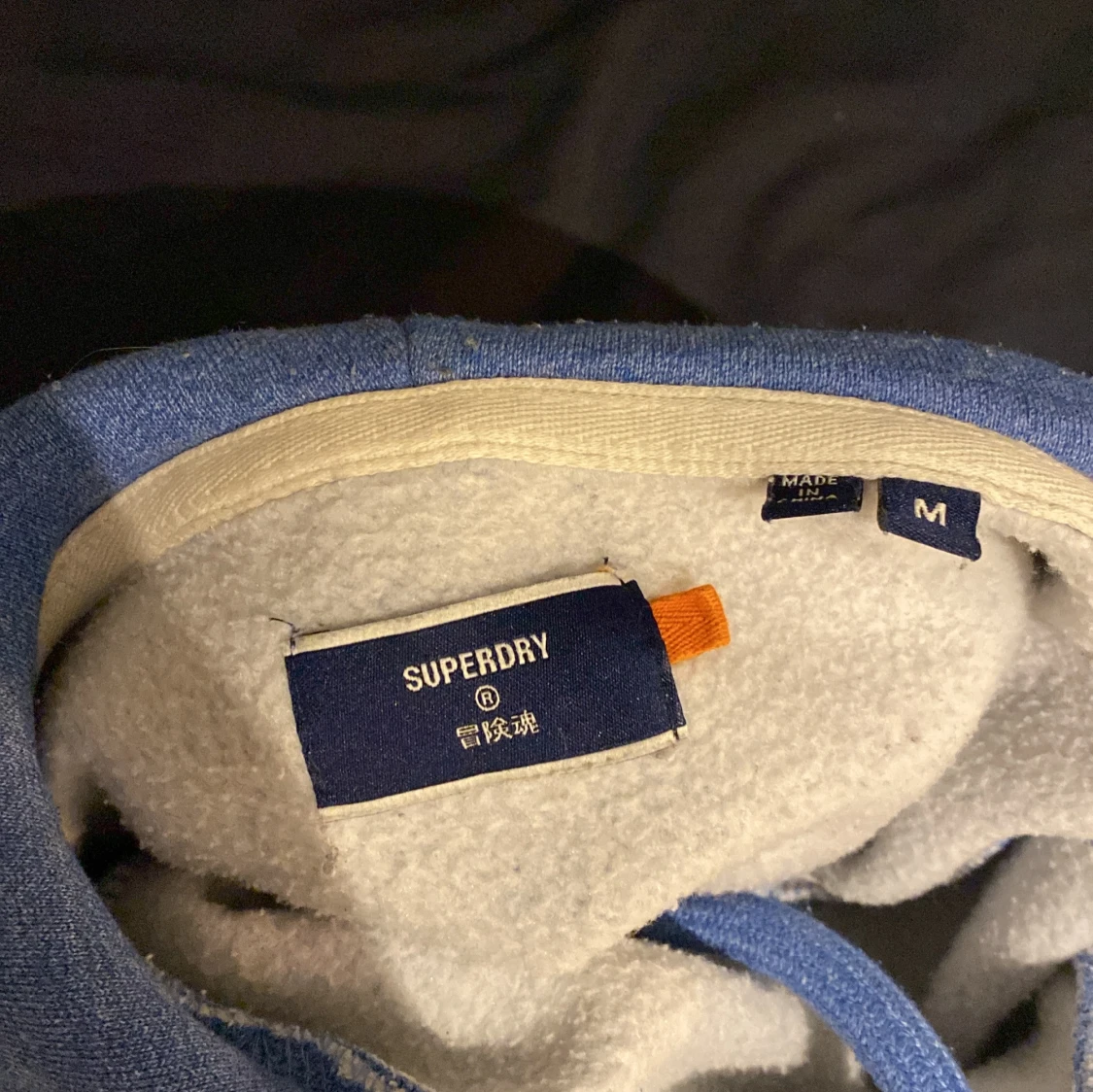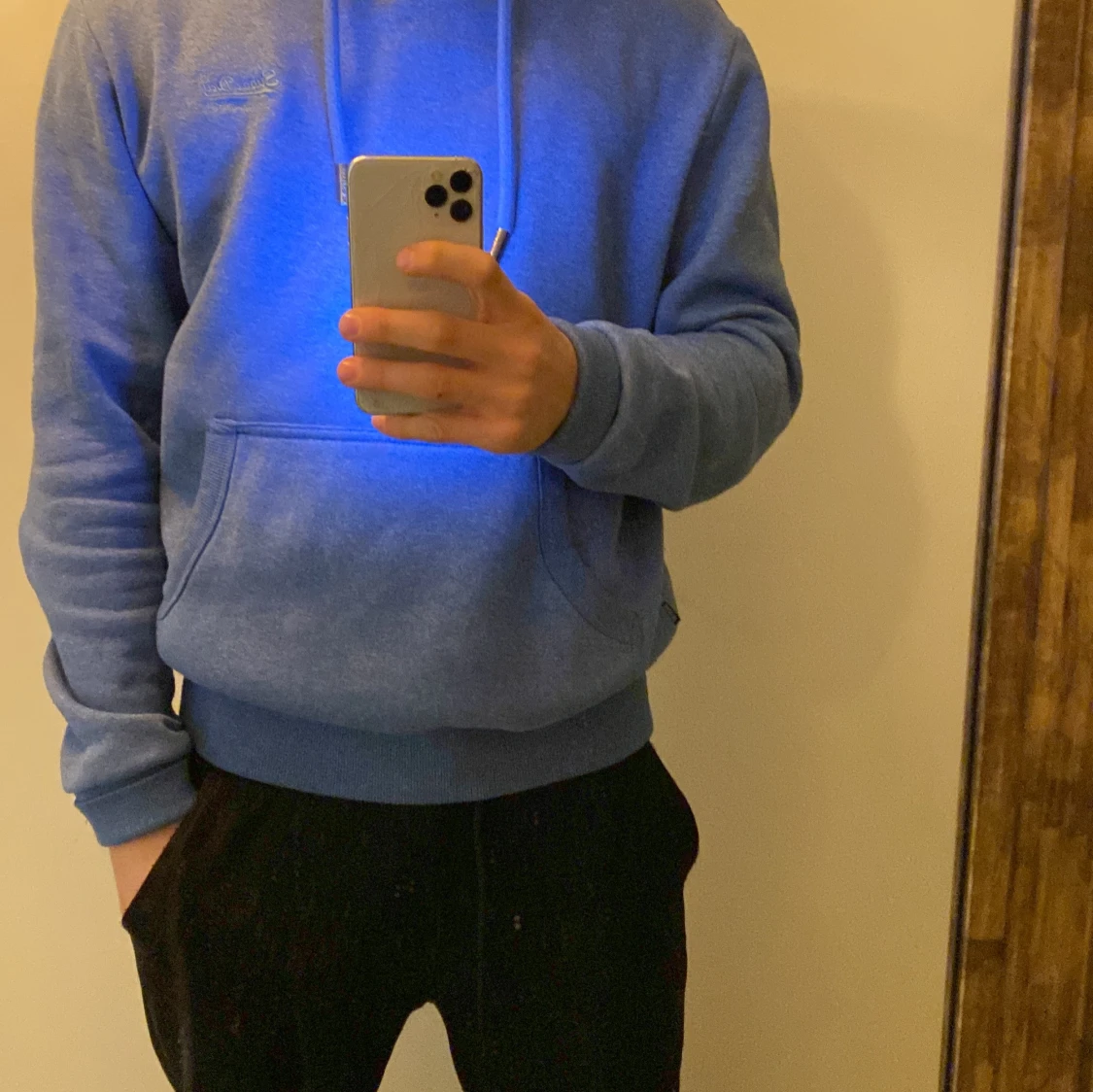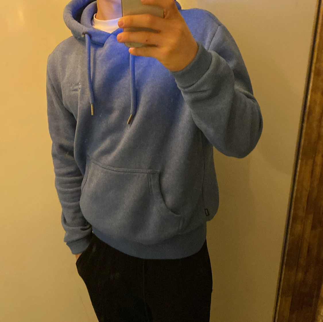 Säljer en blå hoodie från Superdry i storlek M. Tröjan har en klassisk huva med snörning, magficka och ribbade muddar vid ärmslut och nederkant. Mjuk insida i fleece och diskret Superdry-logga på bröstet. Perfekt för chill dagar.