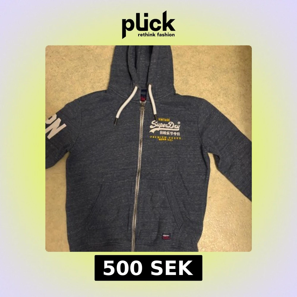 Säljer en mörkblå hoodie från Superdry med vit och gul logga på bröstet och tryck på ärmen. Tröjan har huva med vita snören, hel dragkedja och två fickor fram. Mjuk insida och ribbade muddar. Perfekt för dig som gillar streetwear.