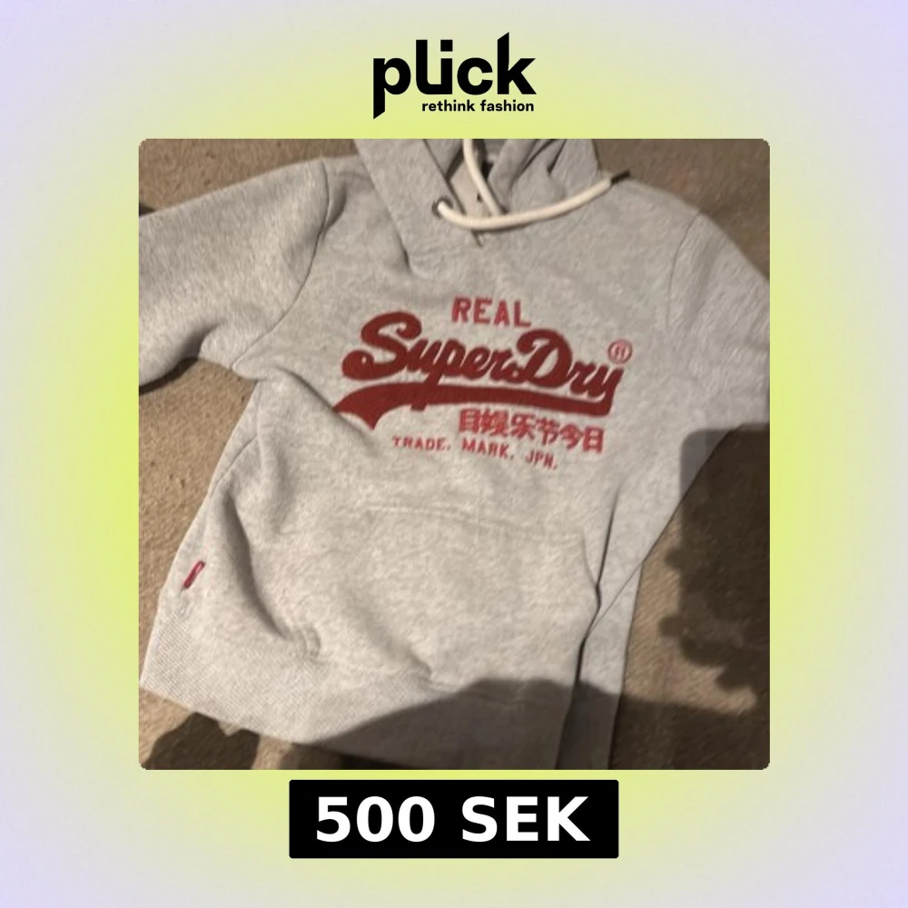 Säljer en grå hoodie från Superdry med stor röd logga och japansk text framtill. Tröjan har huva med vita snören och en klassisk känguruficka. Perfekt för dig som gillar streetwear och vill ha en bekväm och snygg tröja.