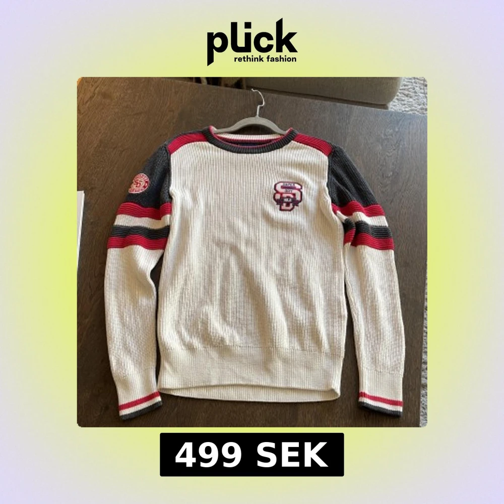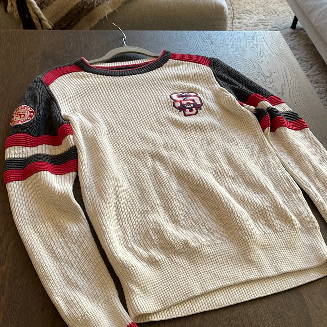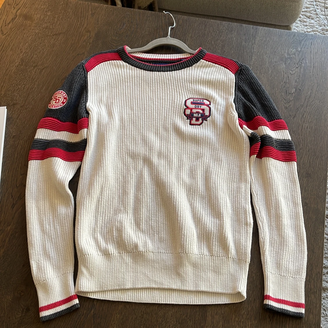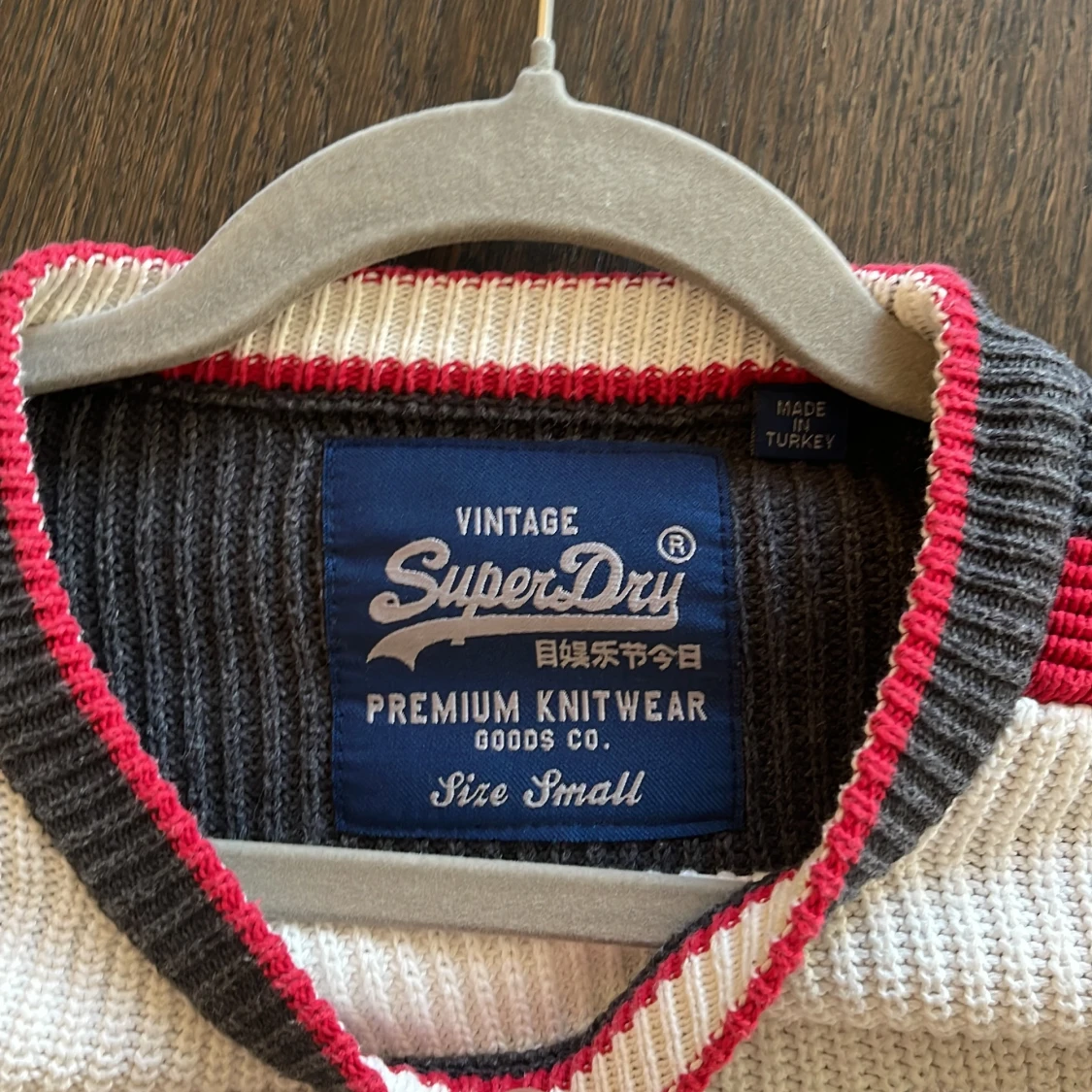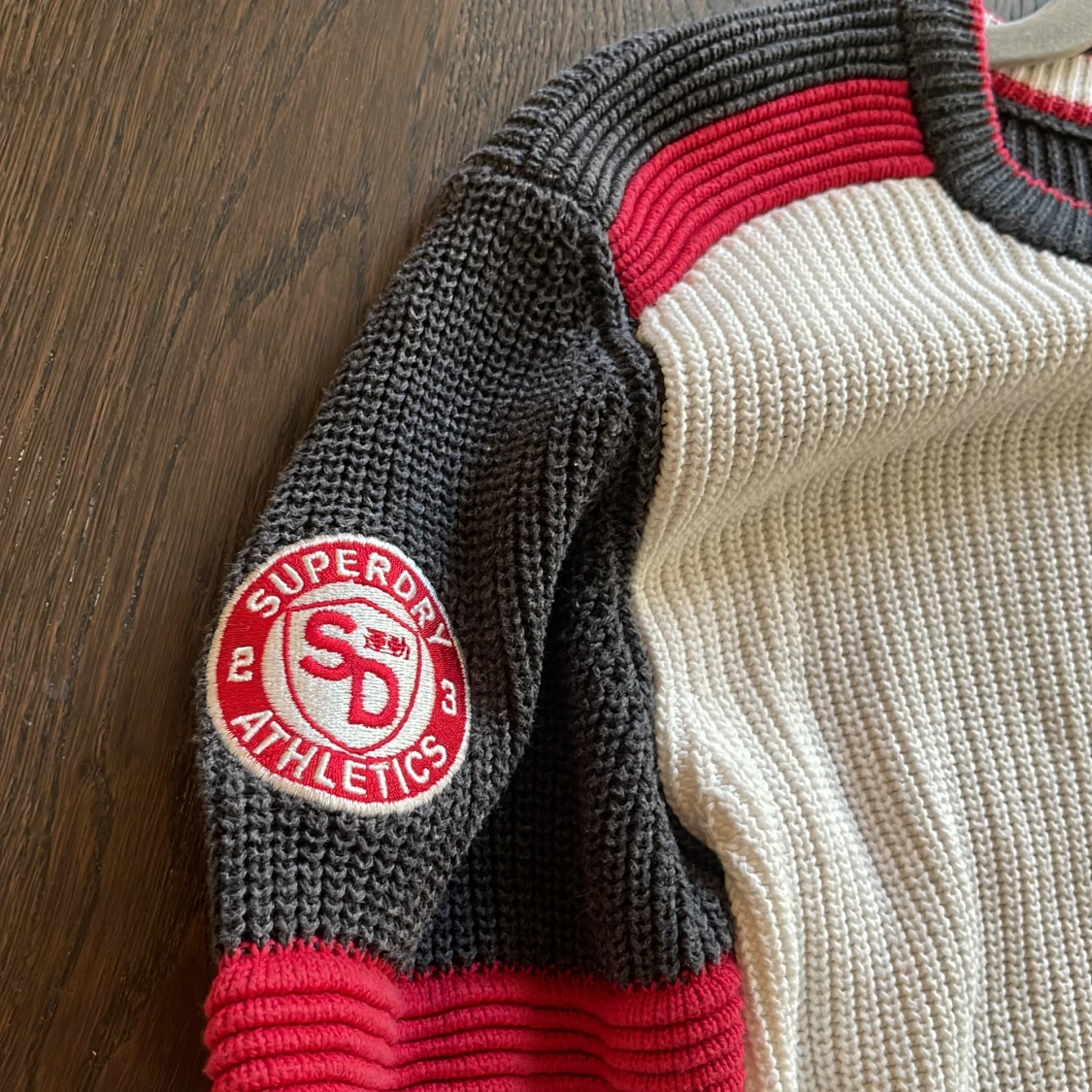 Stickad tröja från Superdry i vintage-stil, vit med mörkgrå och röda detaljer på ärmar och hals. Broderad Superdry-logga på bröstet och patch på ena ärmen. Ribbad struktur och rund hals.