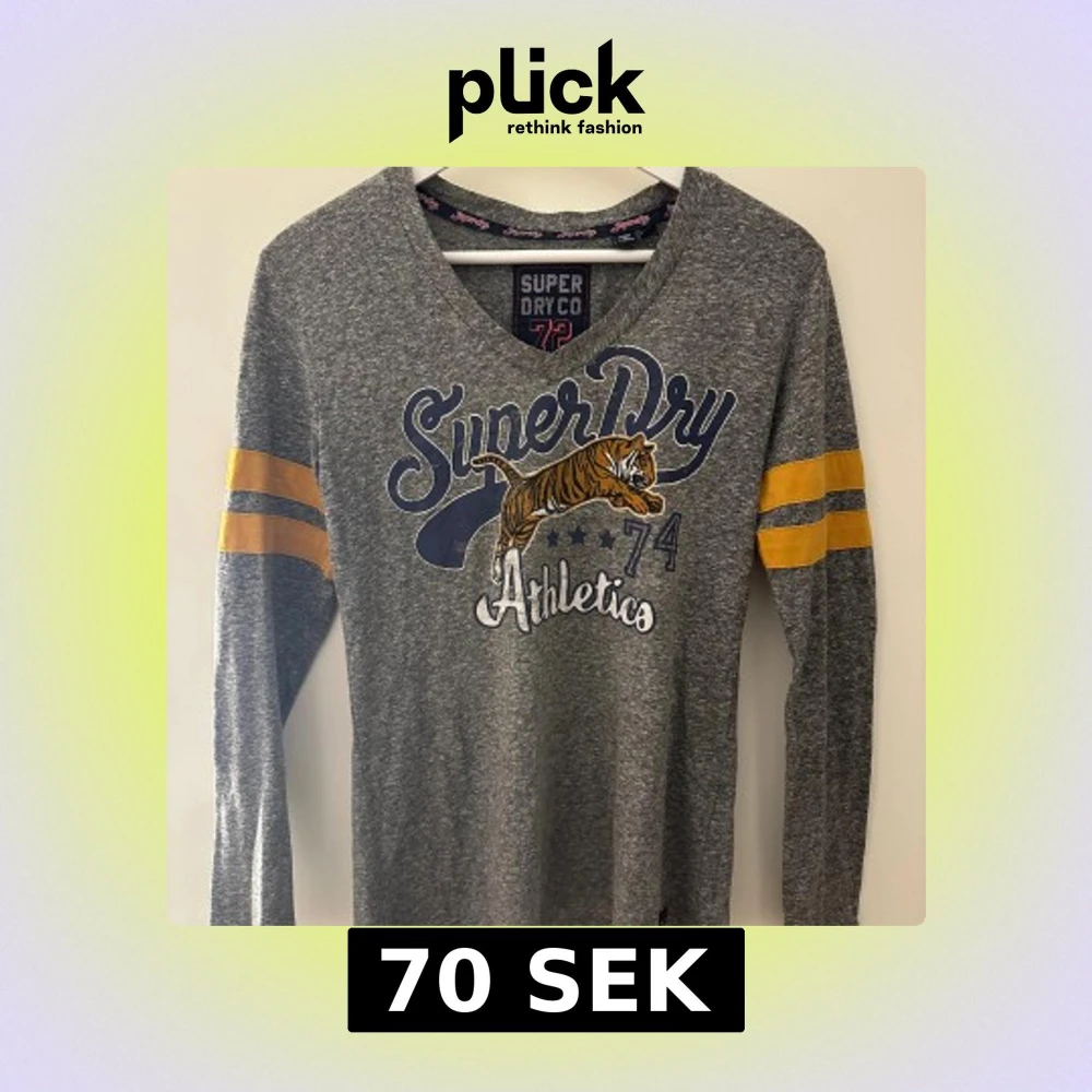 Snygg grå långärmad tröja från Superdry med coolt tryck framtill, tiger och texten 'Athletics'. V-ringad hals och gula ränder på ärmarna ger en sportig vibe. Perfekt för dig som gillar streetstyle och vill sticka ut lite extra.