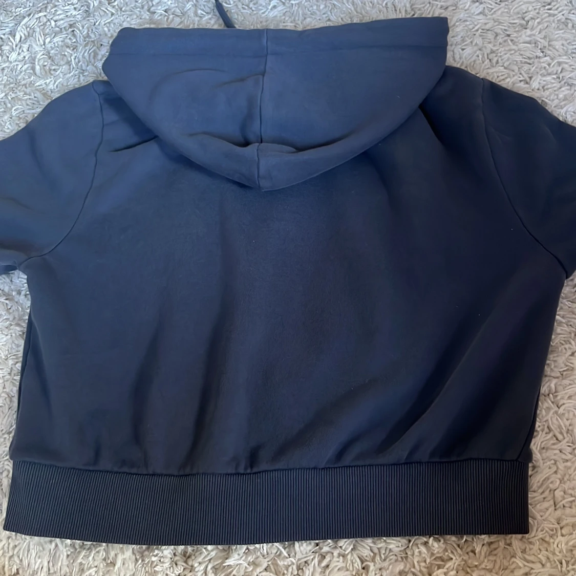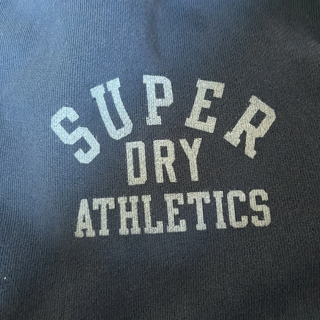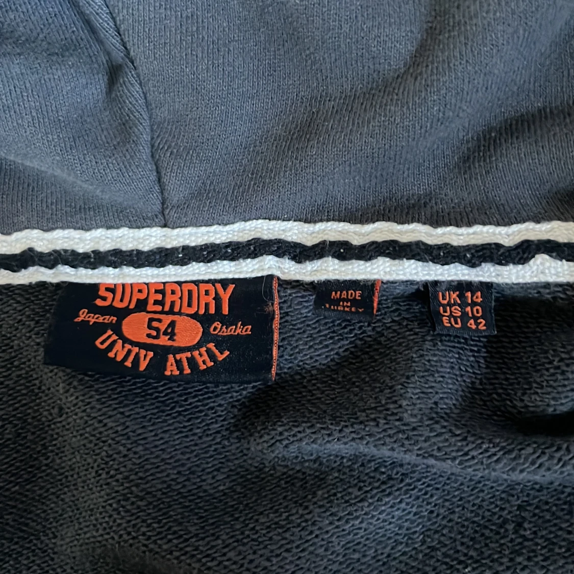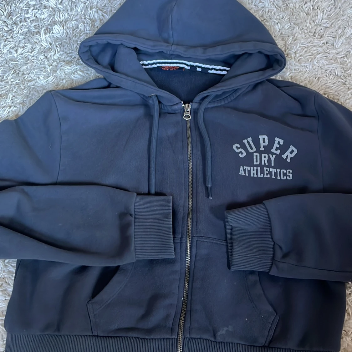 Mörkblå hoodie från Superdry med dragkedja, huva med snörning och vita tryckdetaljer på bröstet. Tröjan har ribbade muddar och två fickor framtill. Perfekt för chill dagar och snygg till jeans eller mjukisbyxor. Andvänd helst inte köp direkt utan skriv först tack🥰
