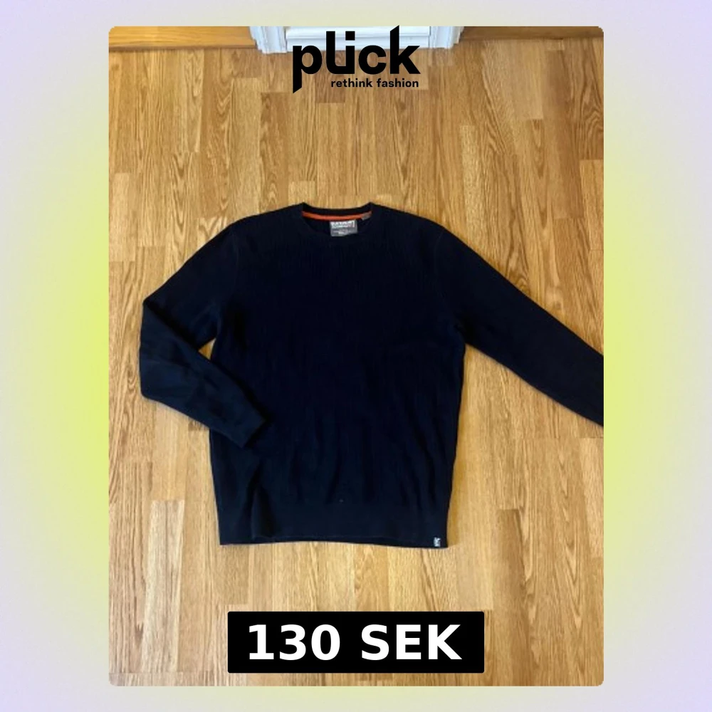 Säljer en mörkblå stickad tröja från Superdry i storlek XL. Tröjan har en grovstickad struktur, rund hals och långa ärmar. Perfekt för dig som gillar enkel och stilren design med diskret logga vid nederkanten.