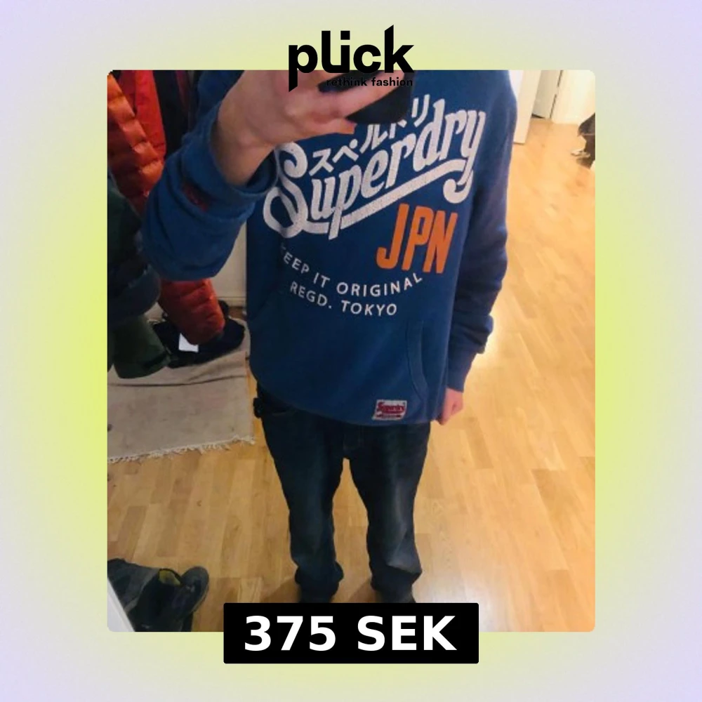 Säljer en blå hoodie från Superdry i storlek XS med stort vitt och orange tryck på bröstet och coola japanska detaljer. Tröjan har huva med breda vita snören och en klassisk känguruficka framtill. Perfekt för dig som gillar streetwear och snygga loggor.