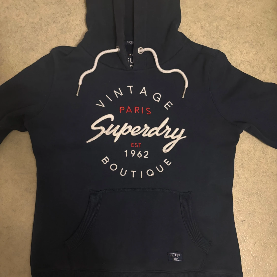 Mörkblå hoodie från Superdry med vit och röd broderad text på bröstet. Tröjan har huva med vita snören och en stor magficka framtill. Klassisk och sportig look, perfekt för chill dagar. Mjuk insida och ribbade muddar vid ärmslut och nederkant.
