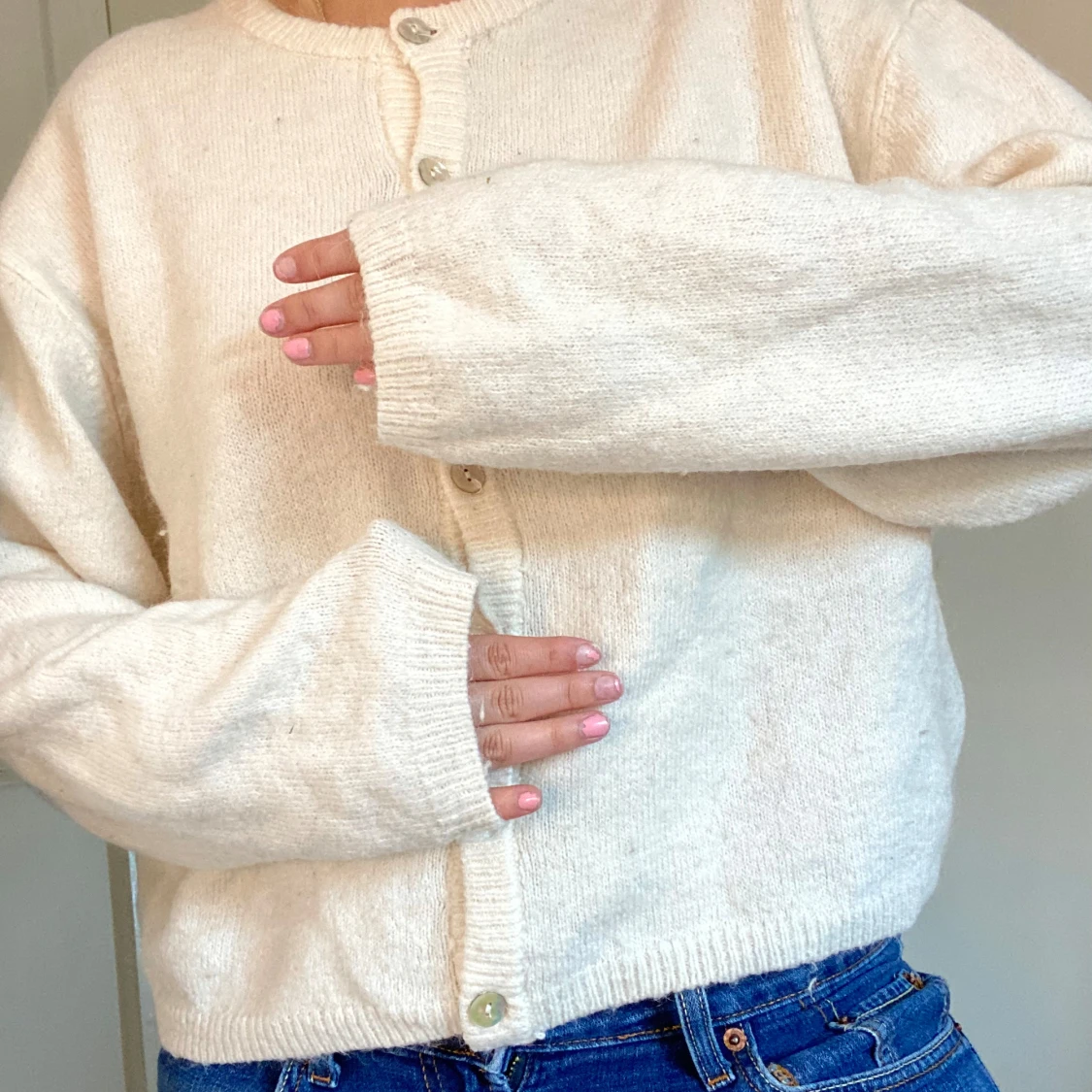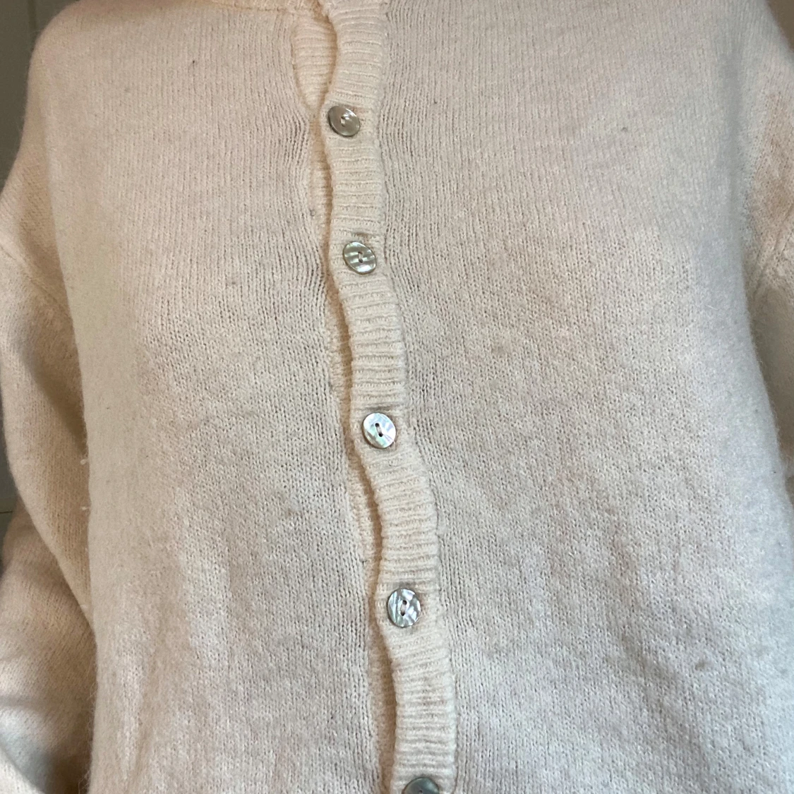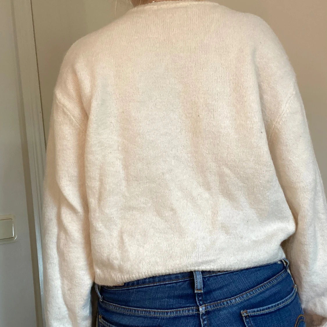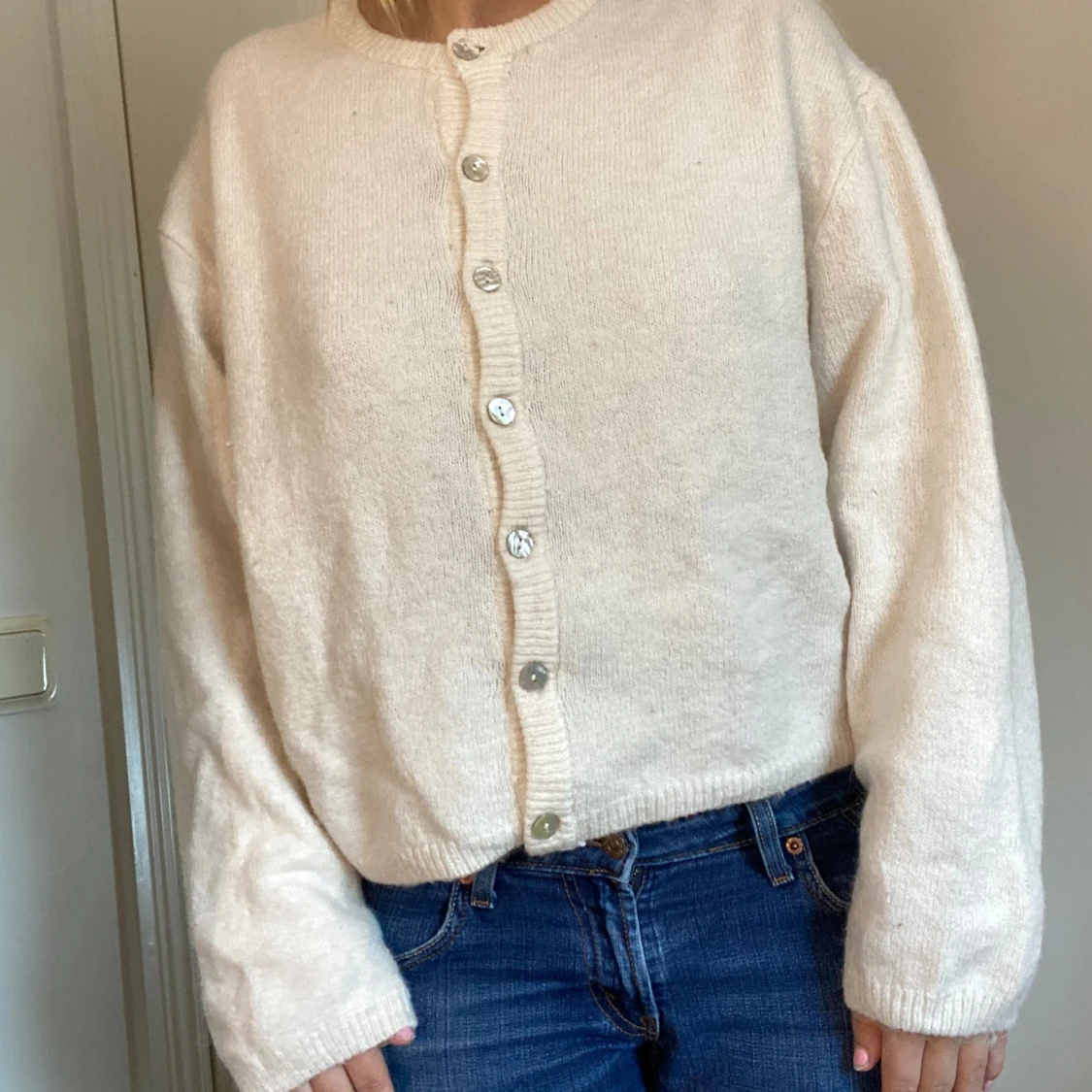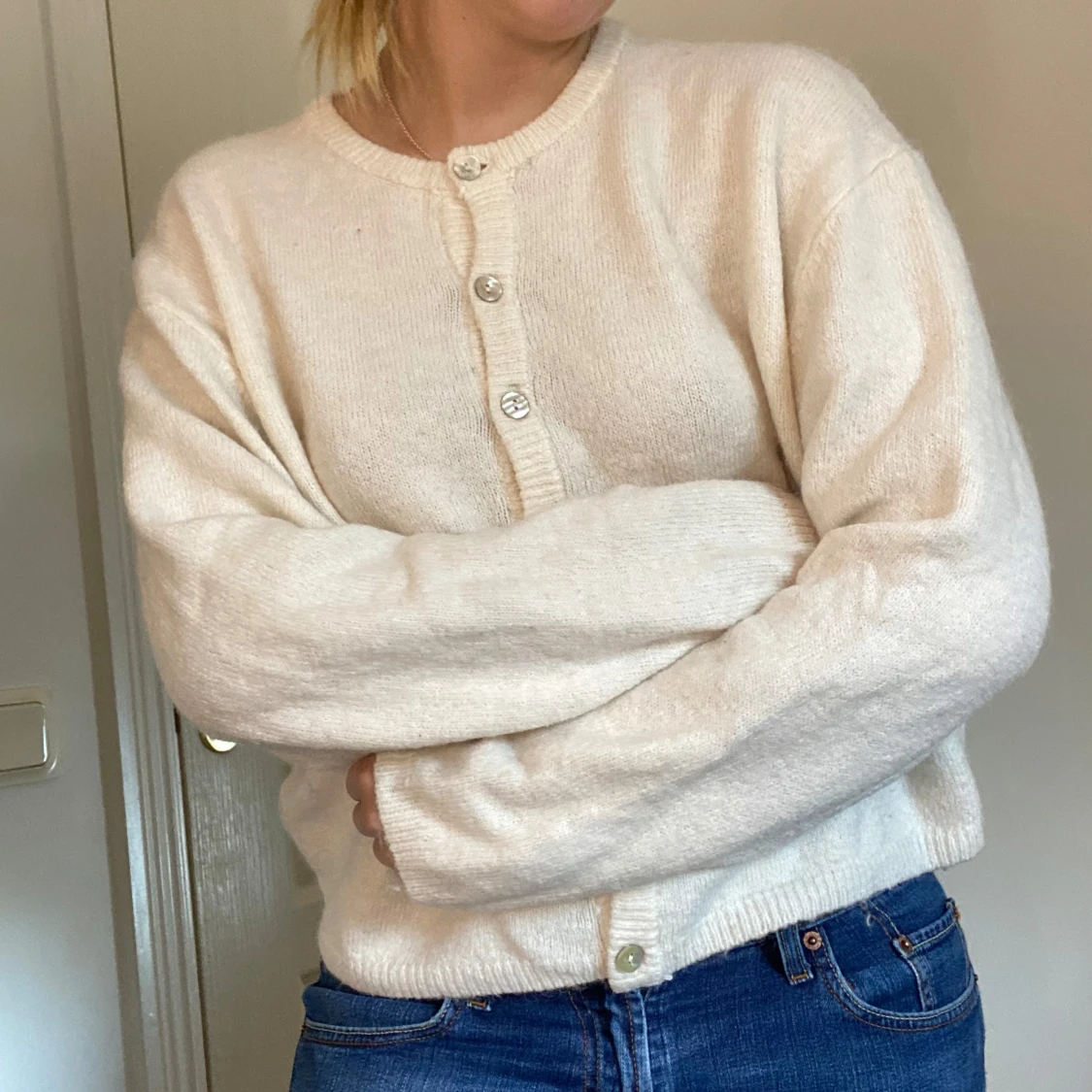 Mysig vit stickad kofta med rund hals och silvriga knappar framtill. Koftan har lÄng Àrm och en rak, nÄgot loose passform. AnvÀnd fÄtal gÄnger. MÀrke Gina Tricot