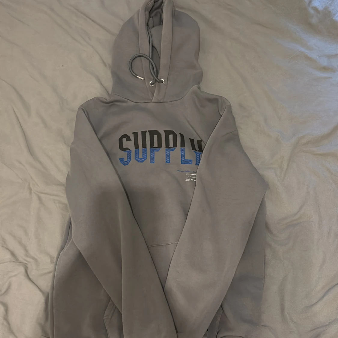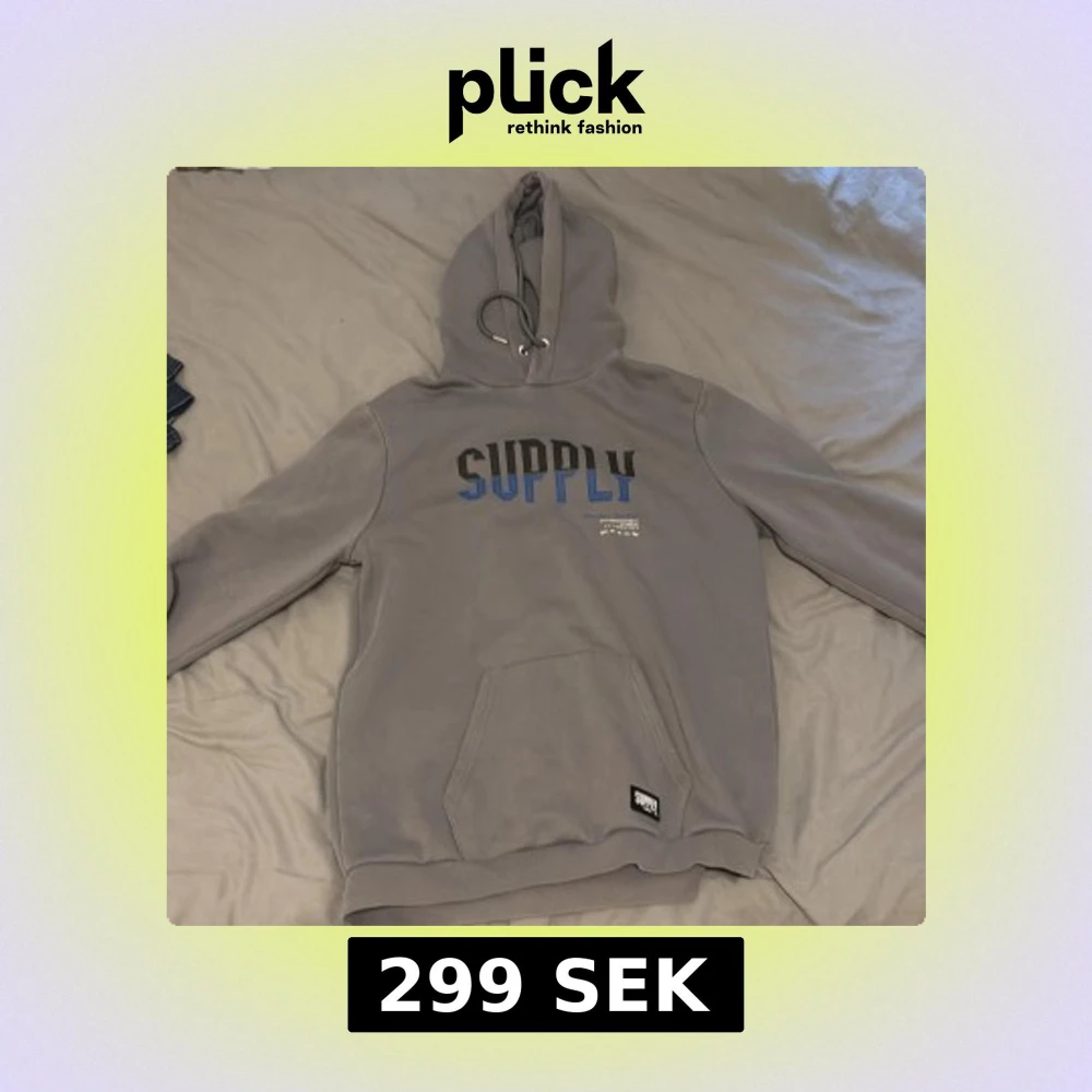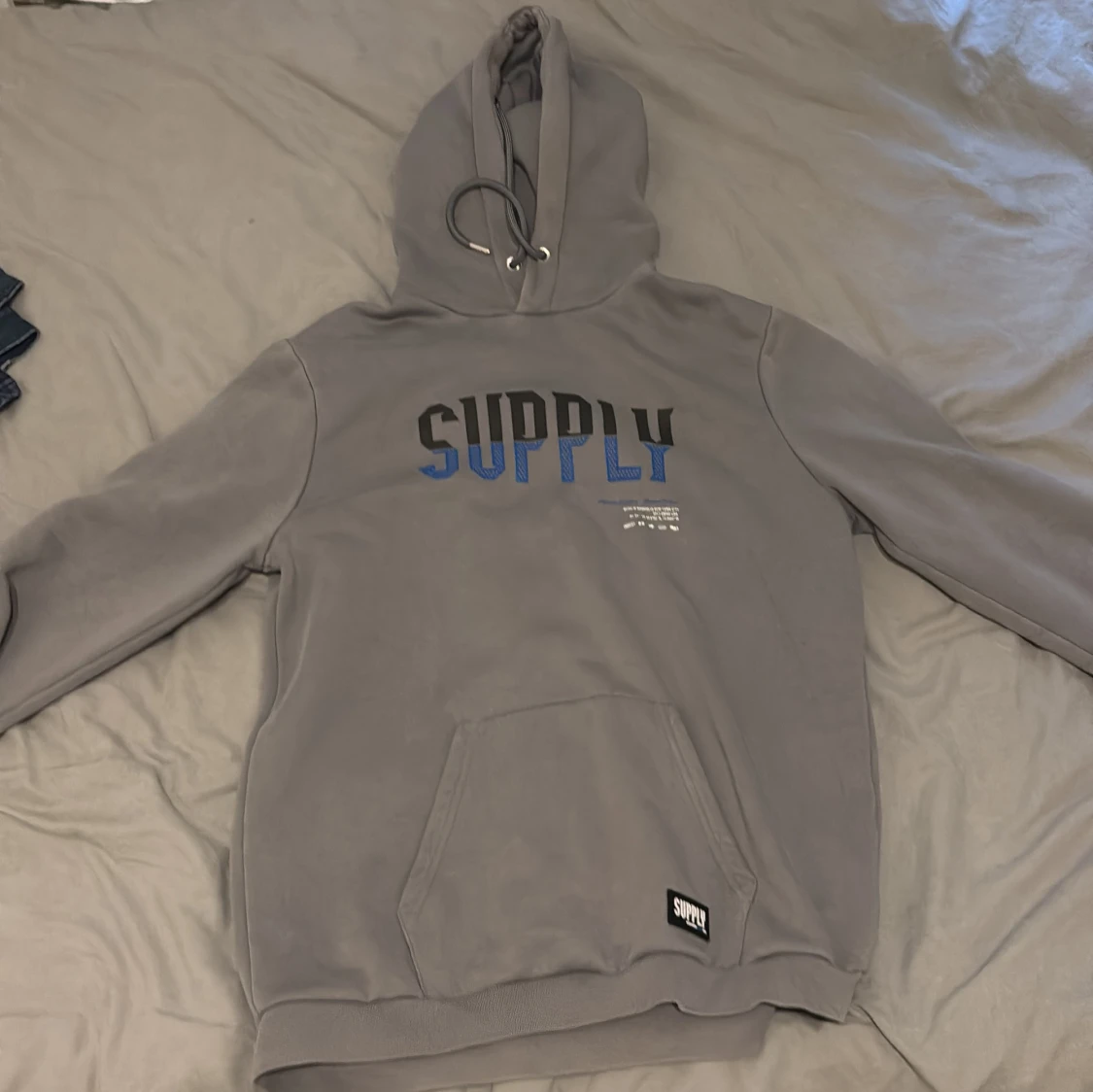 Grå hoodie från Supply and Demand med svart och blått tryck på bröstet. Klassisk känguruficka framtill, justerbar huva med snörning och ribbade muddar. Perfekt för chill dagar och streetstyle. Mjuk och skön känsla.